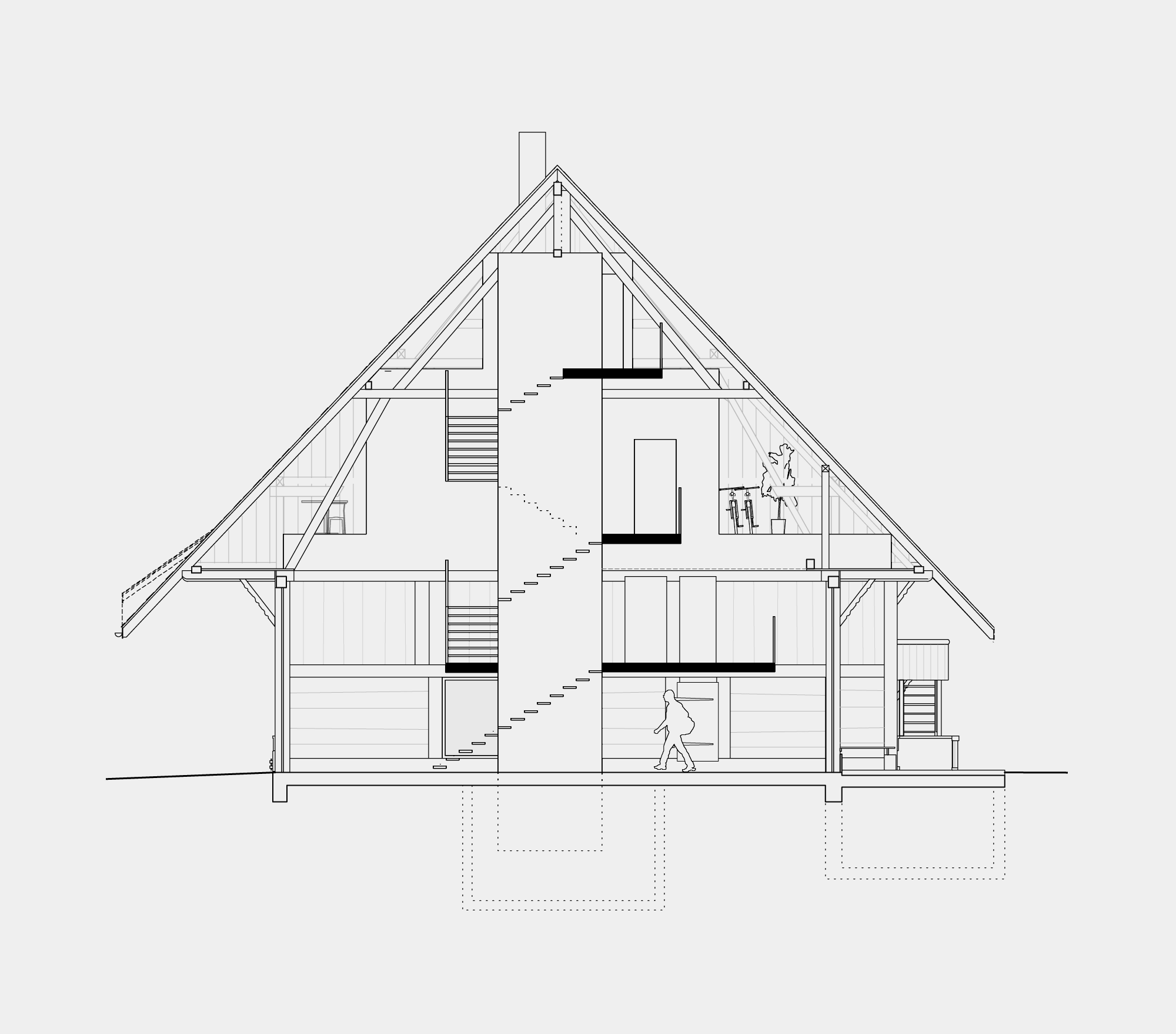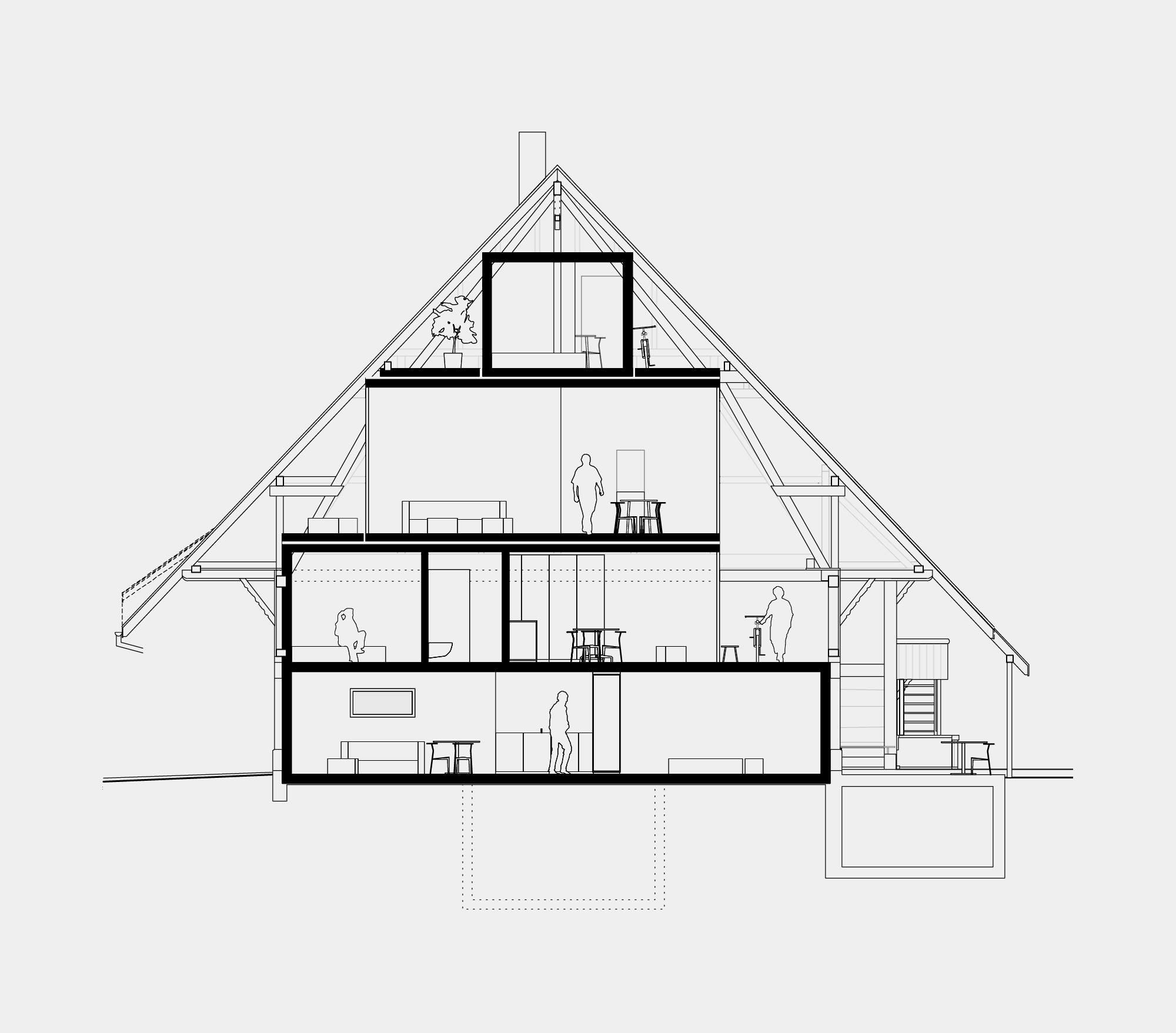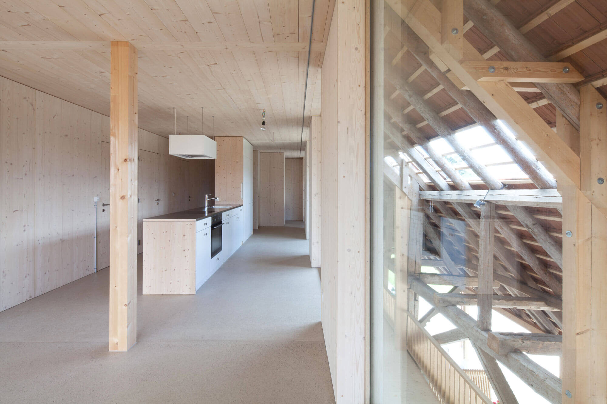 Das zentral liegende, schützenswerte Bauernhaus wurde von der Gemeinde erworben, um Alterswohnungen zu realisieren. Um die Qualitäten des geschützten Gebäudes zu erhalten, wird die bestehende Gebäudestruktur vollständig belassen. Die altersgerechten Wohnungen werden als Elemente in die bestehende Hülle eingebaut. So entsteht im Dachraum eine Vielfalt von privaten und halbprivaten geschützten Aussenräumen. Das Gebäude wird mit einer behindertengerechten Erschliessung (Lift) und die neuen Wohnungen rollstuhlgängig ausgeführt.