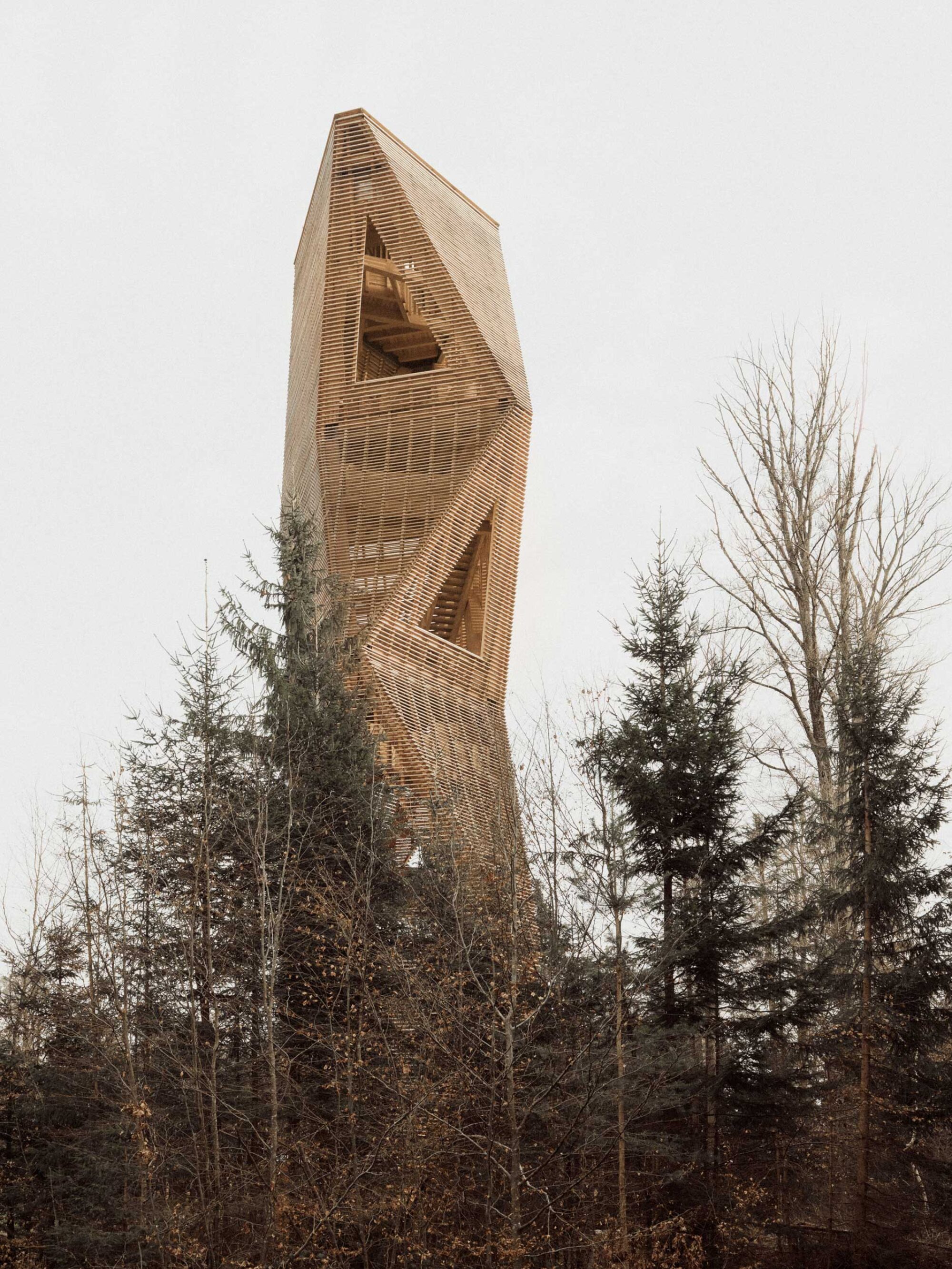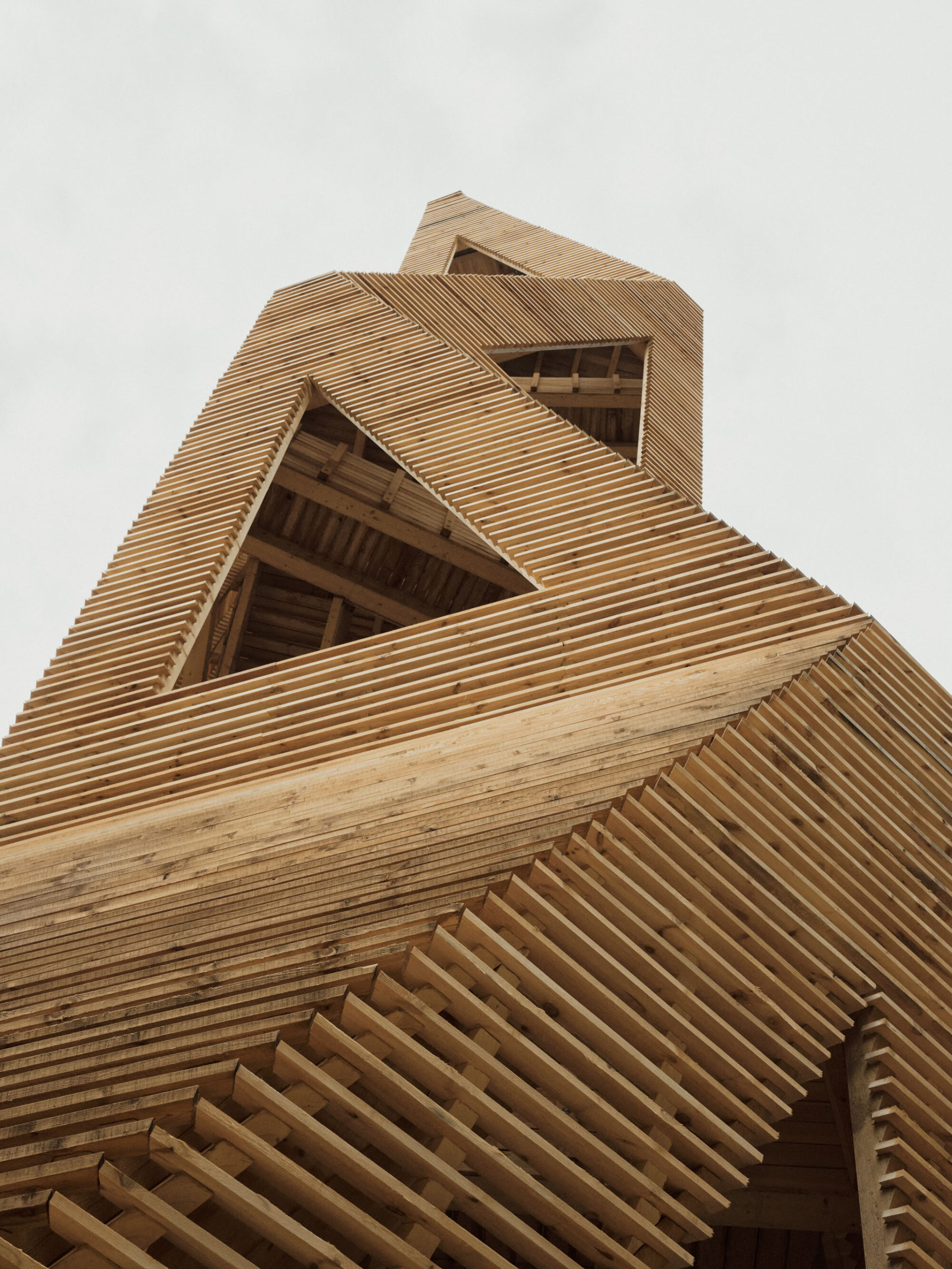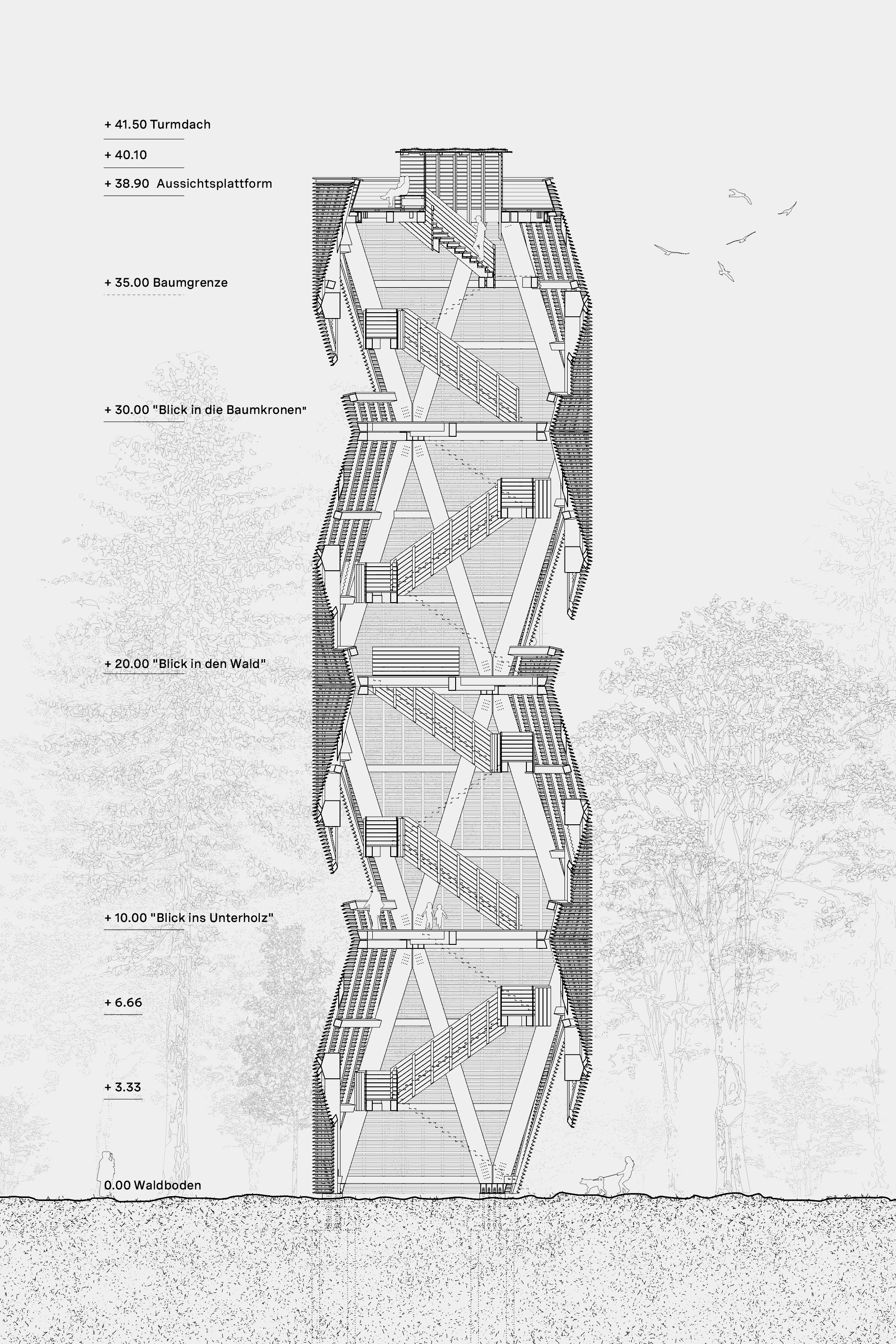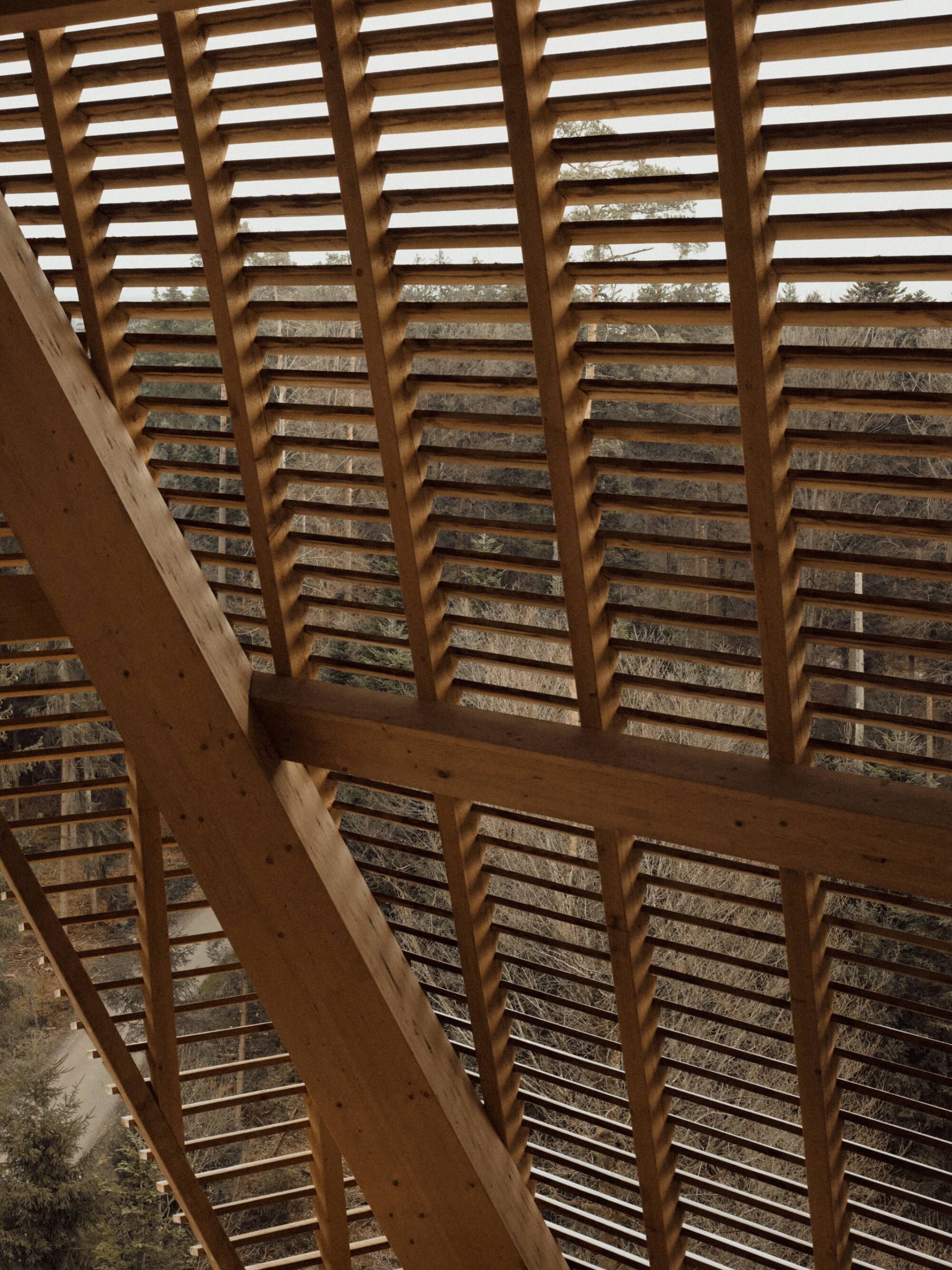 Die Konstruktion ist mit einer schützenden Hülle bekleidet. Die halboffene Schalung wirkt je nach Perspektive geschlossen oder durchlässig. Die Waldluft durchfliesst den Turm und ein Spiel aus Licht und Schatten füllt den Raum.