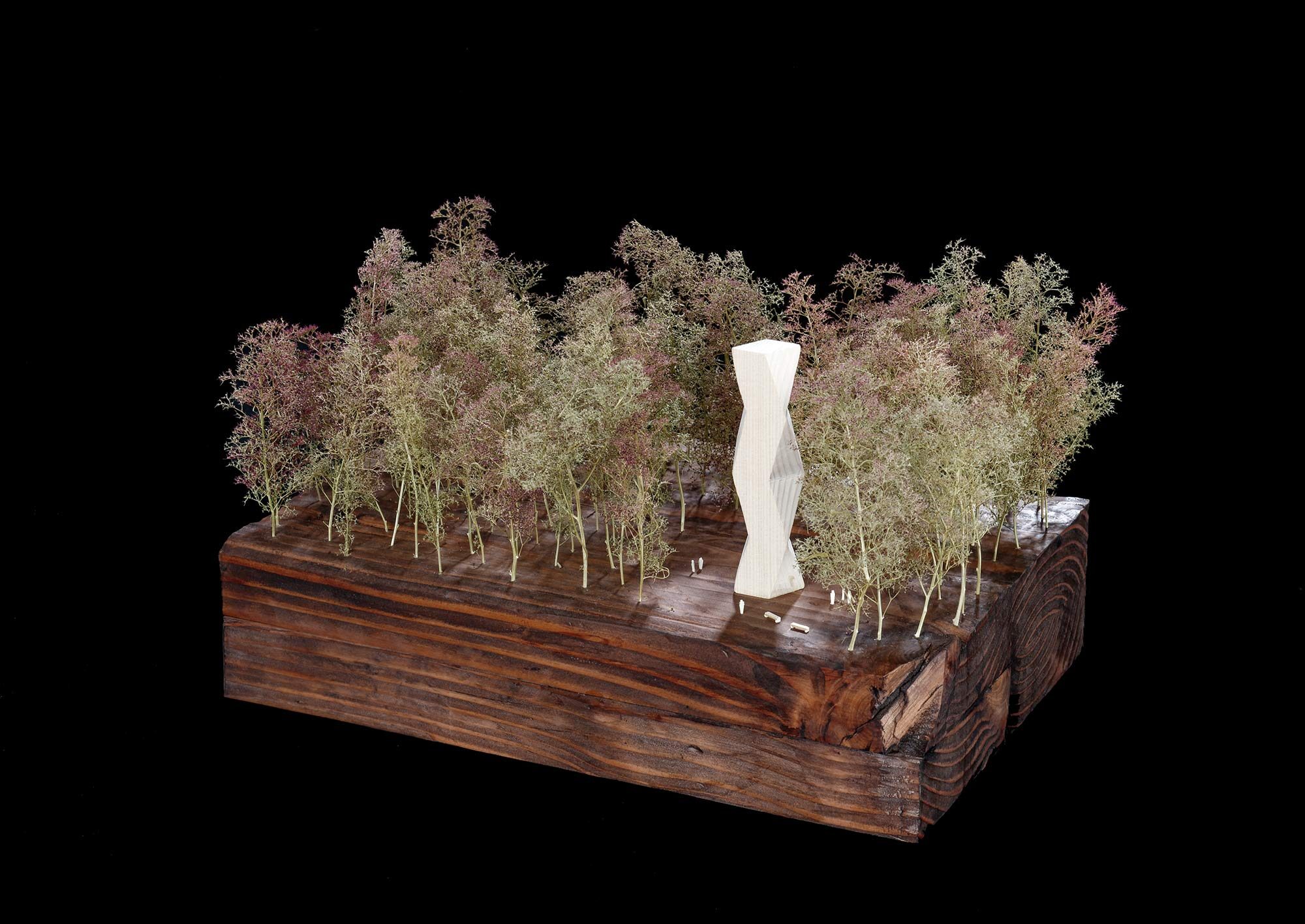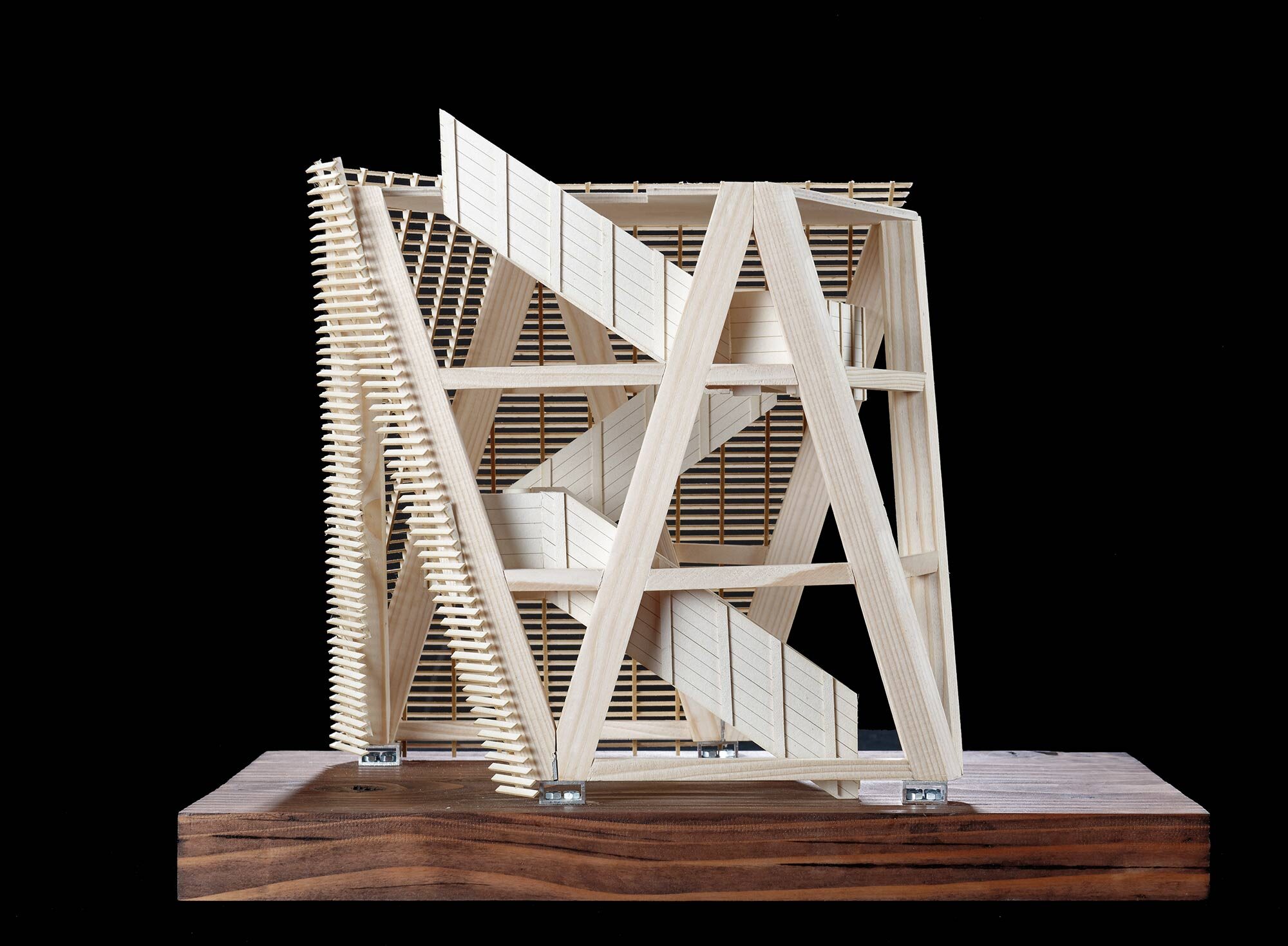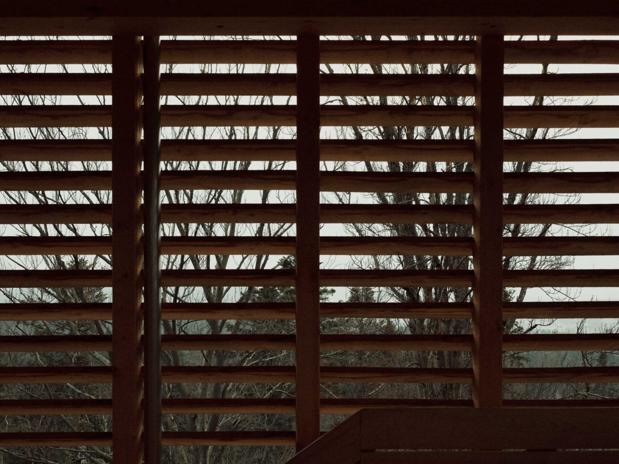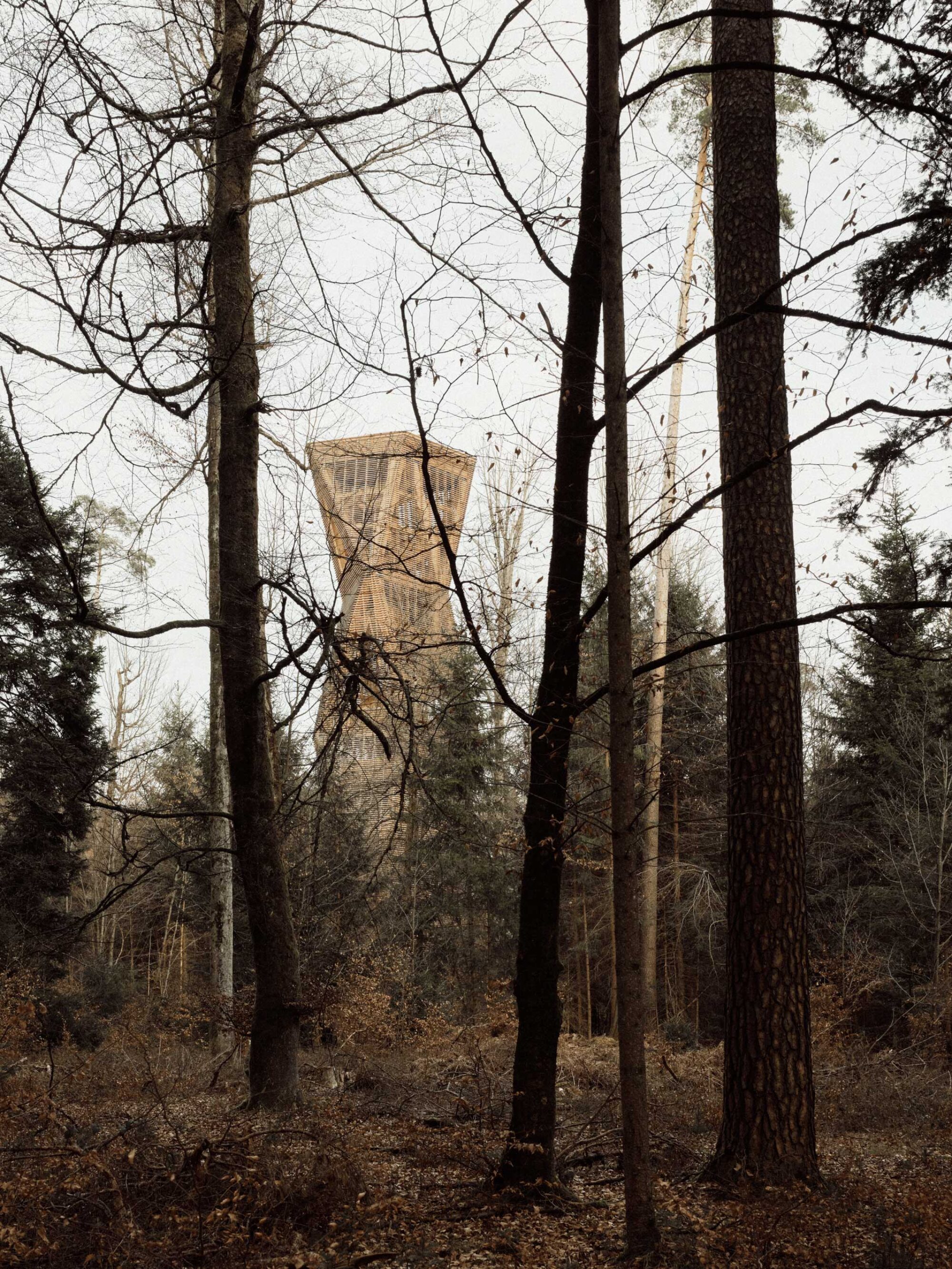 Die Konstruktion ist mit einer schützenden Hülle bekleidet. Die halboffene Schalung wirkt je nach Perspektive geschlossen oder durchlässig. Die Waldluft durchfliesst den Turm und ein Spiel aus Licht und Schatten füllt den Raum.