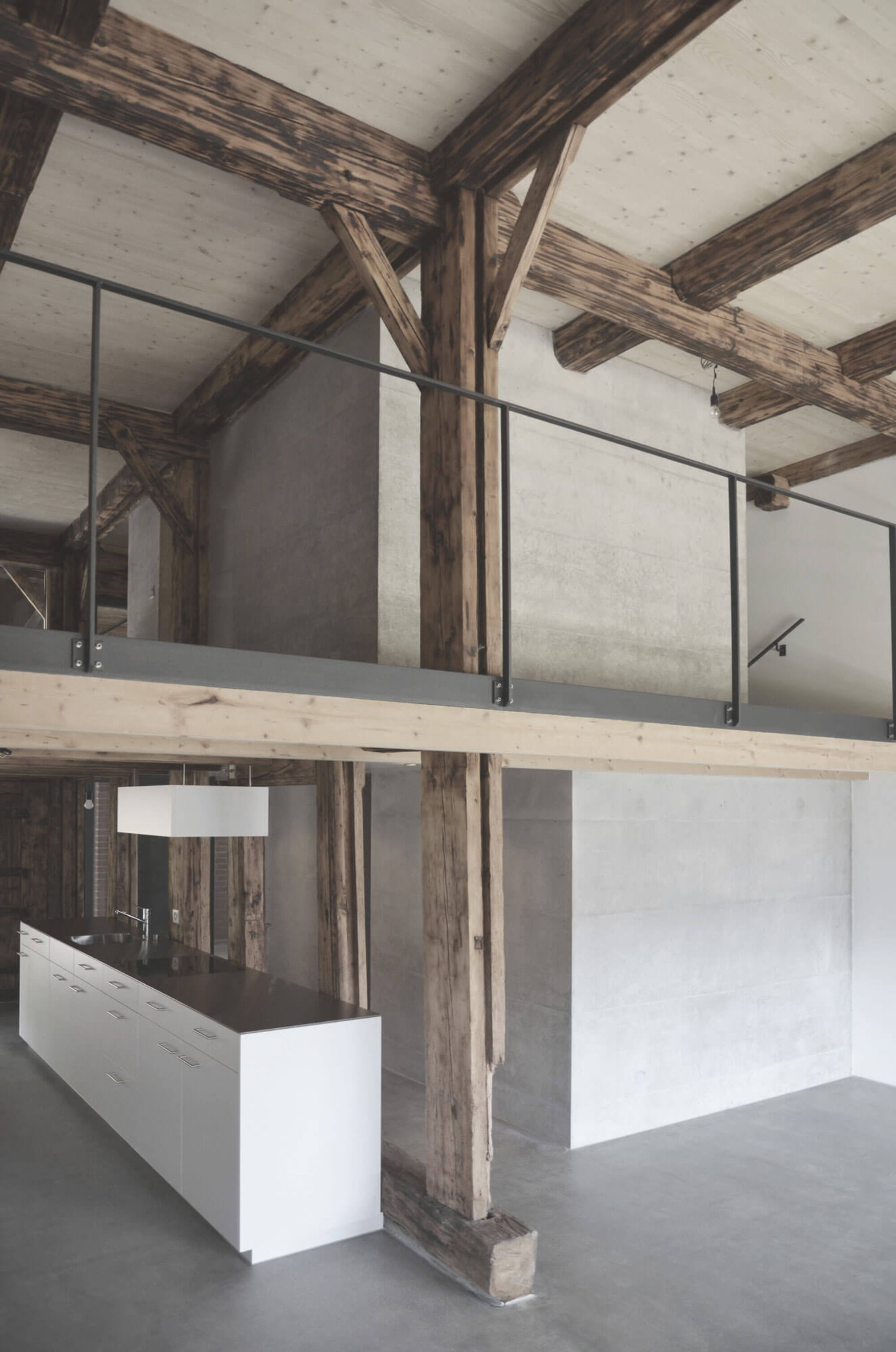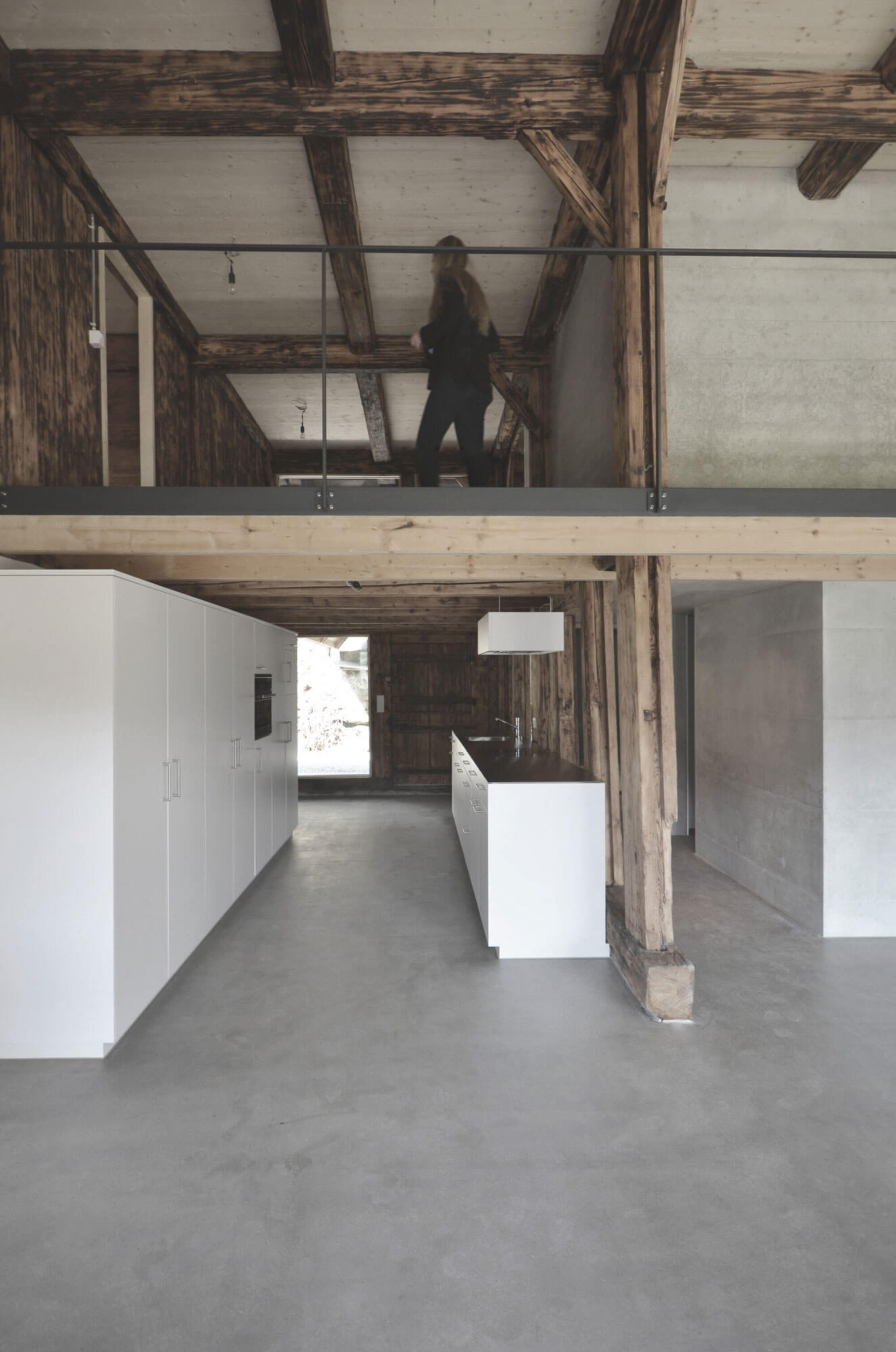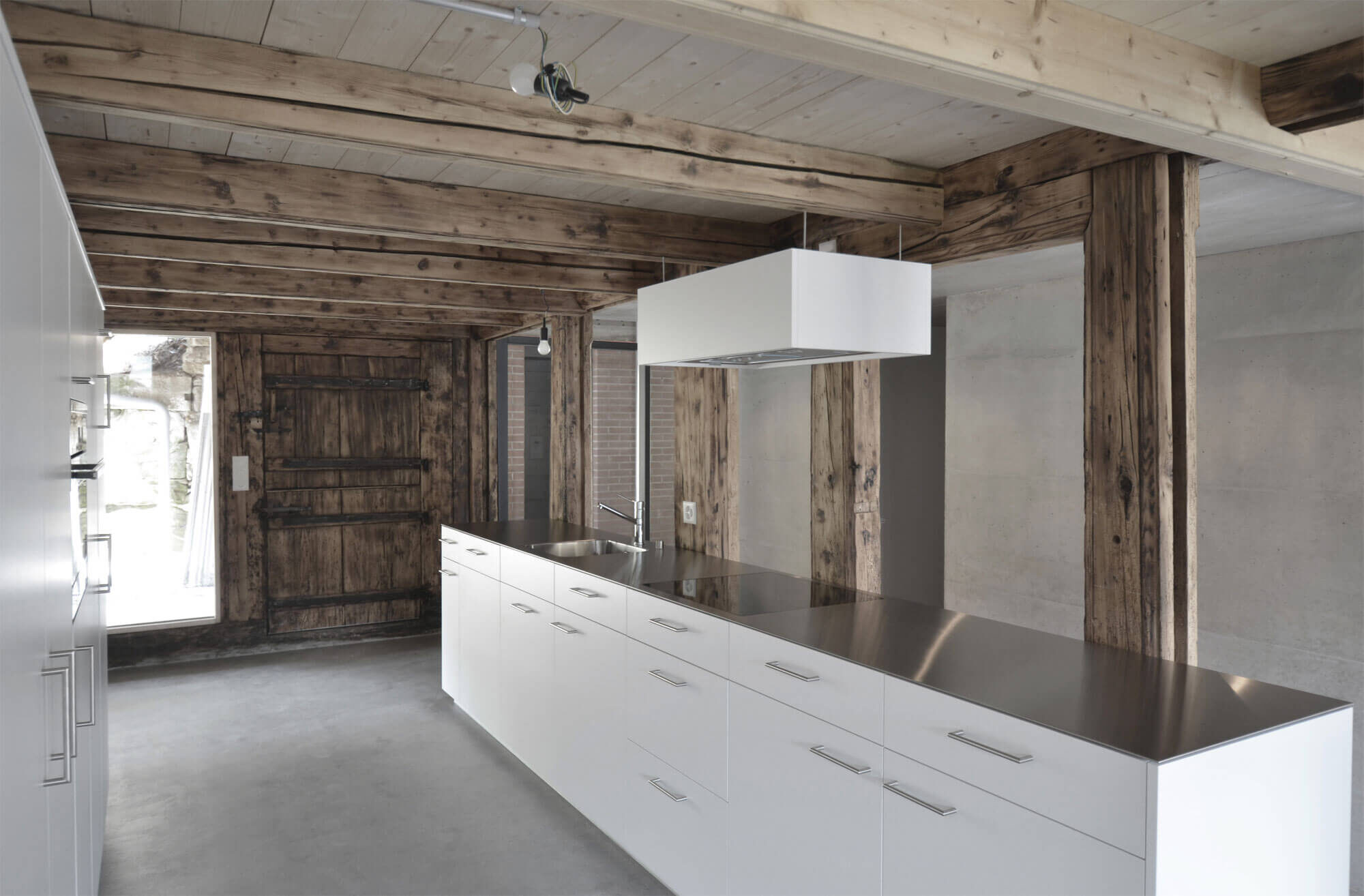 Die Eingriffe an dem, alleine auf einer grosszügigen Lichtung gelegenen, erhaltenswerten Bauernhaus aus dem Jahre 1808 beschränken sich auf den bestehenden Wohntrakt und die Tenne. Die ursprüngliche Dreiteilung des Grundrisses wurde im Umbau fortgeführt, die offene Rauchküche als Thema räumlich und optisch wieder aufgenommen und als zentraler zweigeschossiger Raum neu umgesetzt. Ein in der Mitte versetzter Betonkubus durchringt die beiden Geschosse und beinhaltet die neuen Bäder und den Aufgang ins Schlafgeschoss.