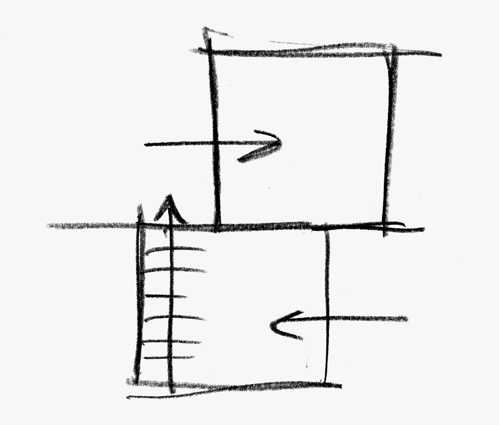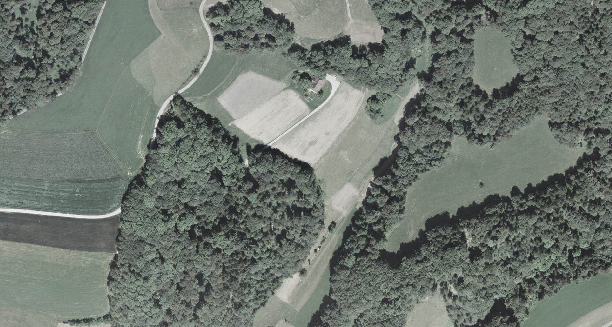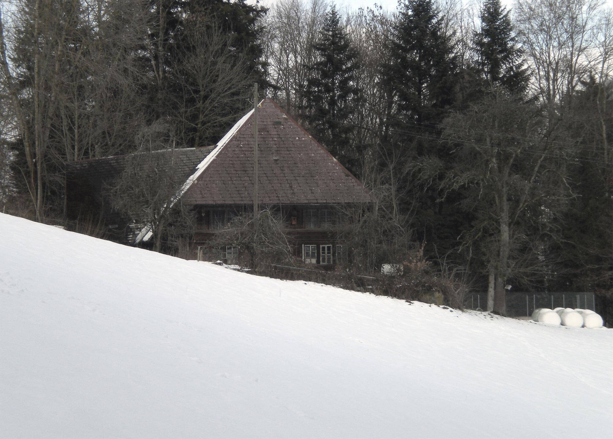 Die Eingriffe an dem, alleine auf einer grosszügigen Lichtung gelegenen, erhaltenswerten Bauernhaus aus dem Jahre 1808 beschränken sich auf den bestehenden Wohntrakt und die Tenne. Die ursprüngliche Dreiteilung des Grundrisses wurde im Umbau fortgeführt, die offene Rauchküche als Thema räumlich und optisch wieder aufgenommen und als zentraler zweigeschossiger Raum neu umgesetzt. Ein in der Mitte versetzter Betonkubus durchringt die beiden Geschosse und beinhaltet die neuen Bäder und den Aufgang ins Schlafgeschoss.