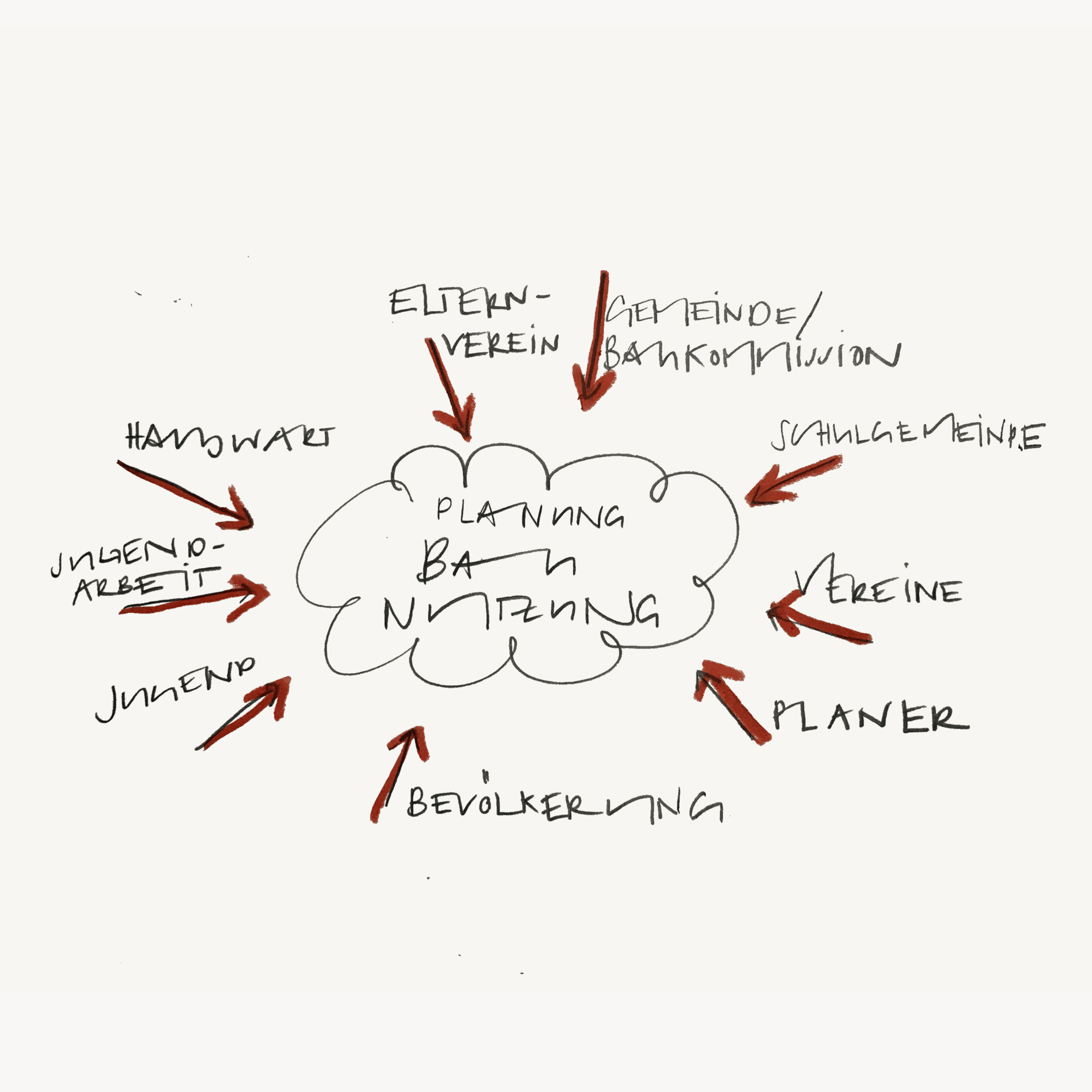 Unser Vorschlag für den Bau des neuen Veranstaltungs- und Jugendhauses ist ein partizipatives Verfahren, welches in der Form von Workshops, Projektwochen etc. von der Ermittlung der Bedürfnisse bis zur Baustelle, die Zusammenarbeit mit den zukünftigen Nutzern sucht. Die Jugendlichen und andere interessierte Uitikoner können auf der Baustelle und in der Planung mit anpacken und gleichzeitig neue Berufsgruppen kennenlernen.