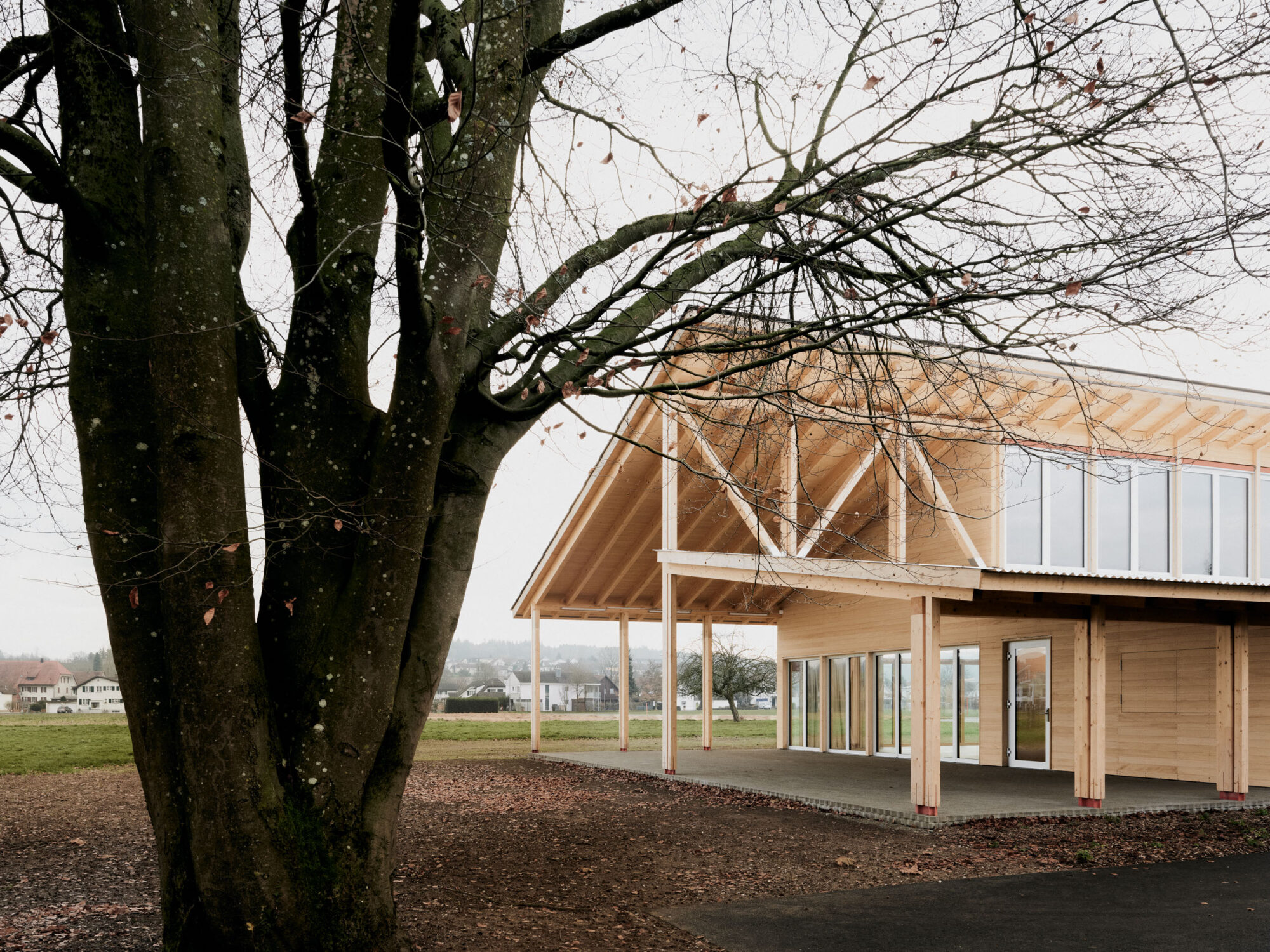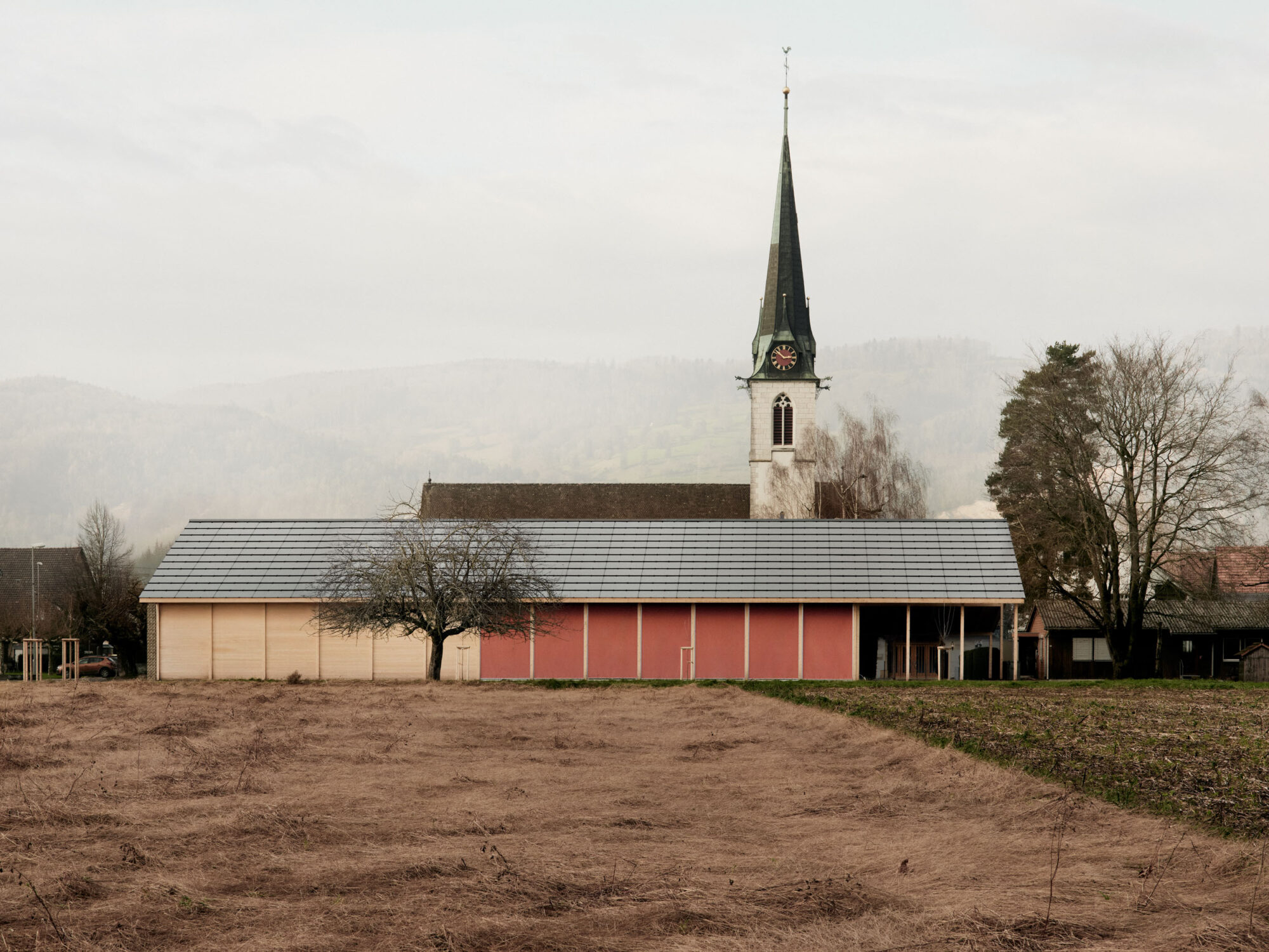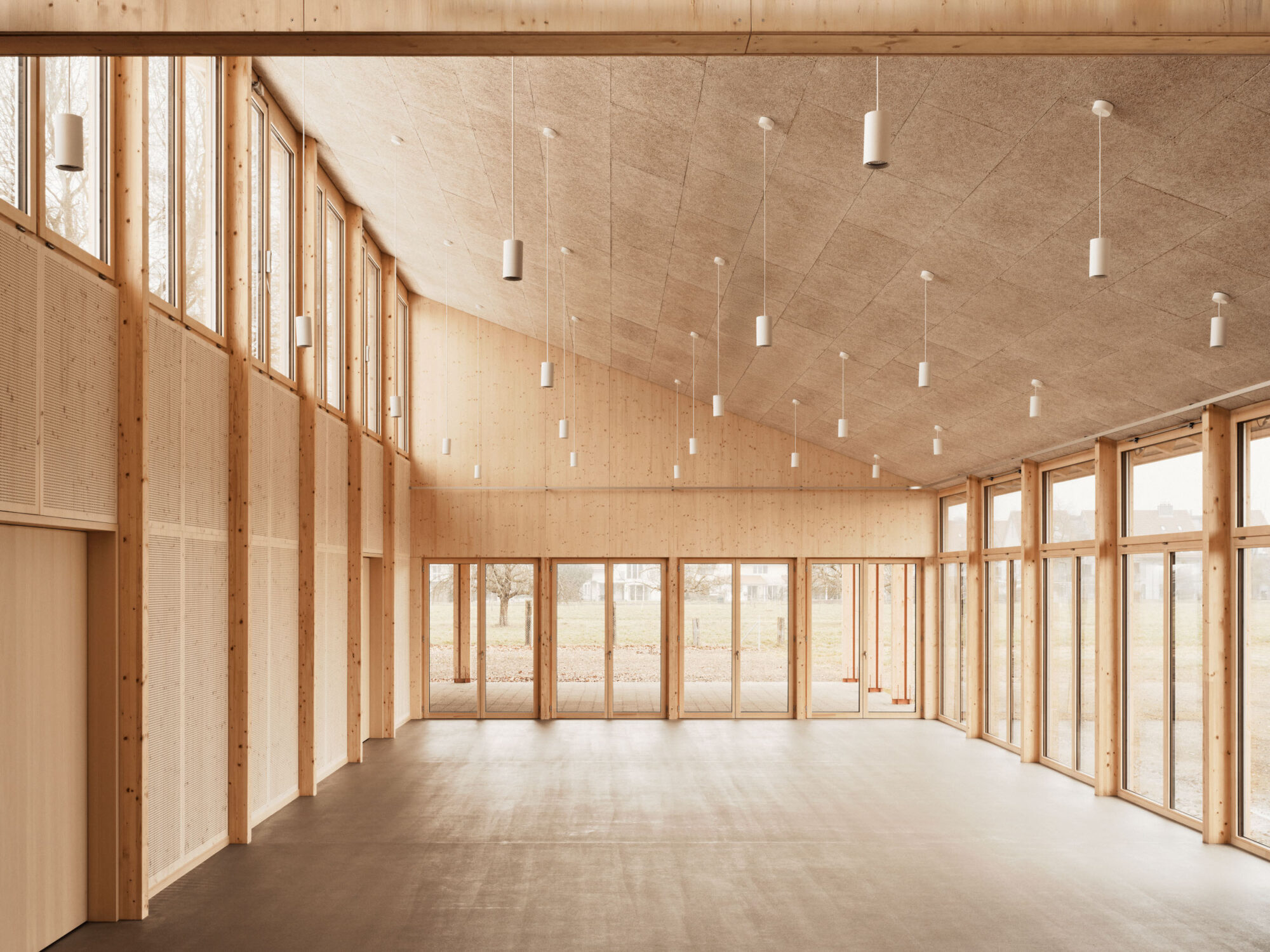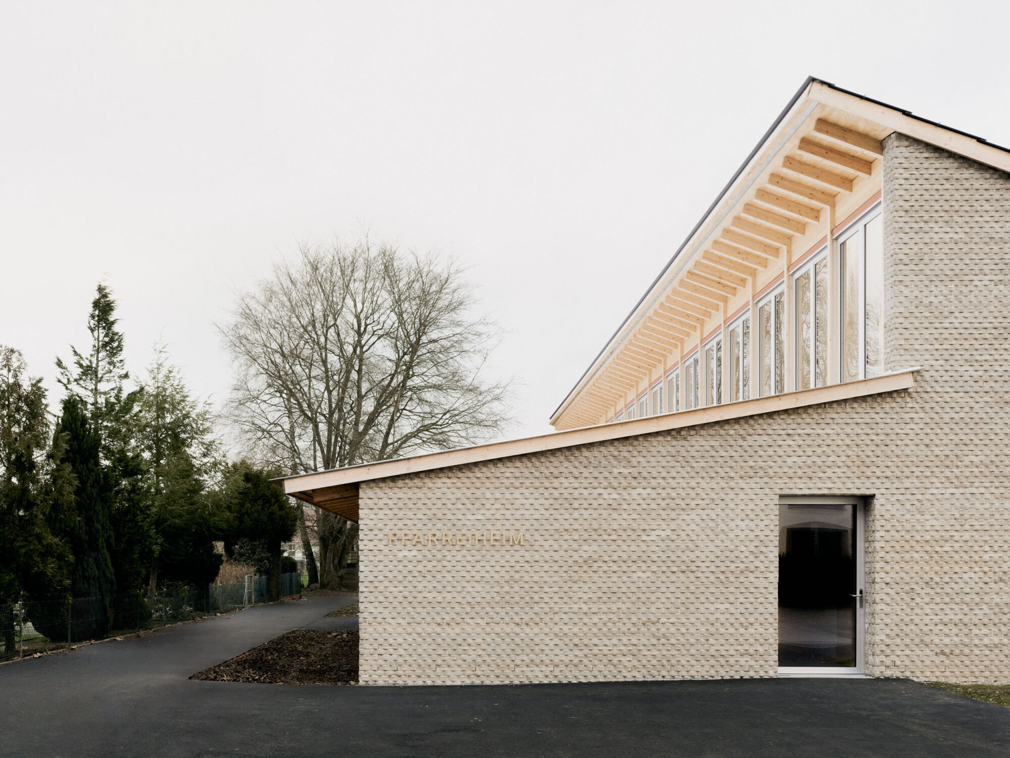 Der Holzsystembau bietet grosse Flexibilität und ermöglicht eine hohe Vorfertigung in der Erstellung.Die Firstpfette des Pfarreiheims ist in der Höhe versetzt, wodurch im Innenraum interessante räumliche und visuelle Qualitäten entstehen und dem Gebäude eine prägnante Silhouette geben. Die einfache Gebäudestruktur zieht sich im Osten des Gebäudes weiter und schafft so eine gedeckte Terrasse. Diese ist sowohl direkt vom Saal, dem Herzstück des Gebäudes, als auch über den Korridor unabhängig zugänglich.
