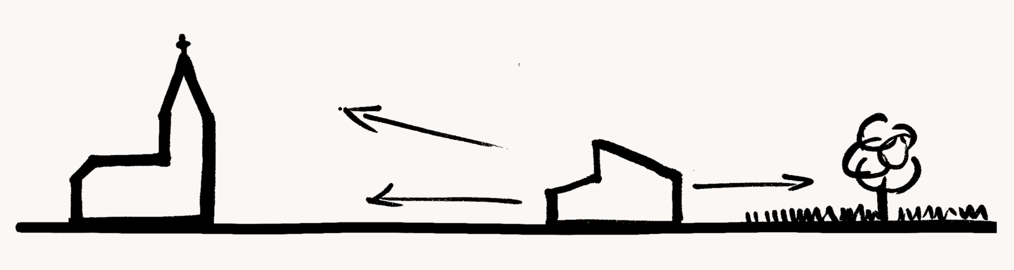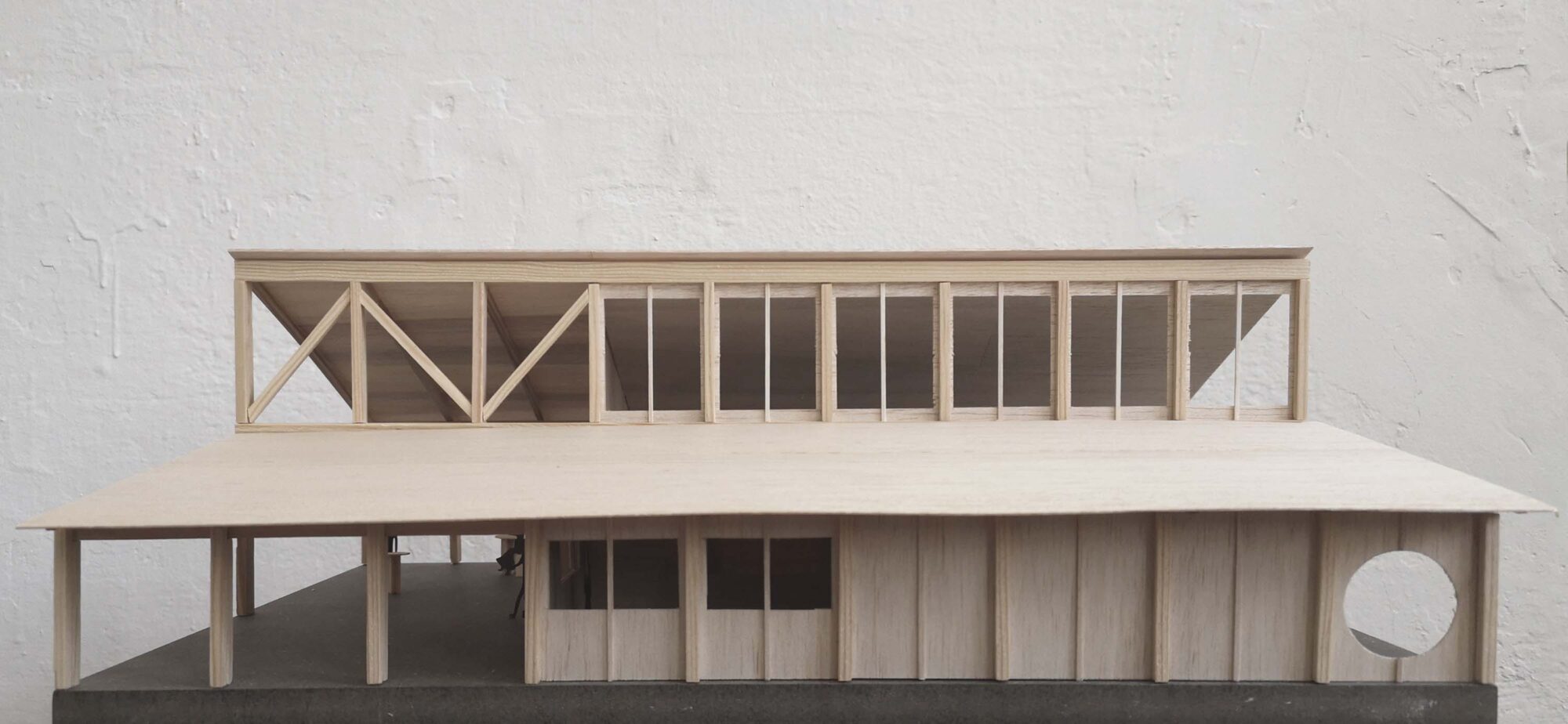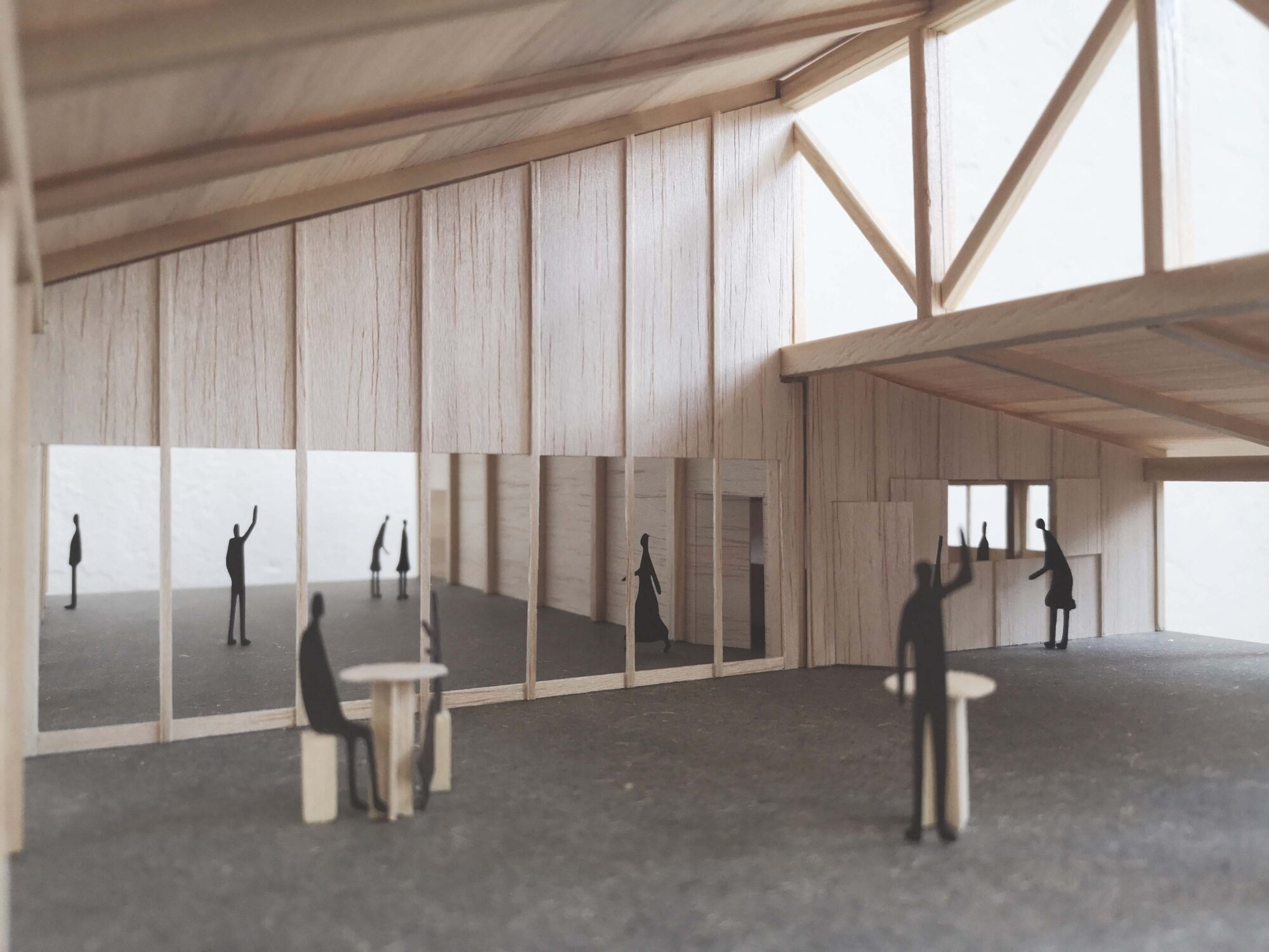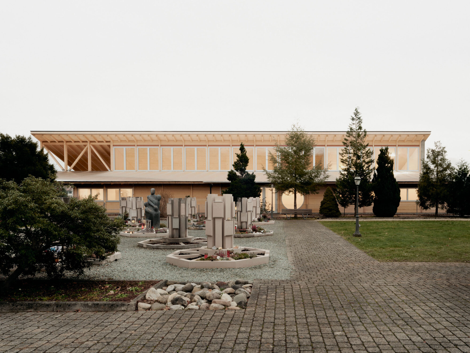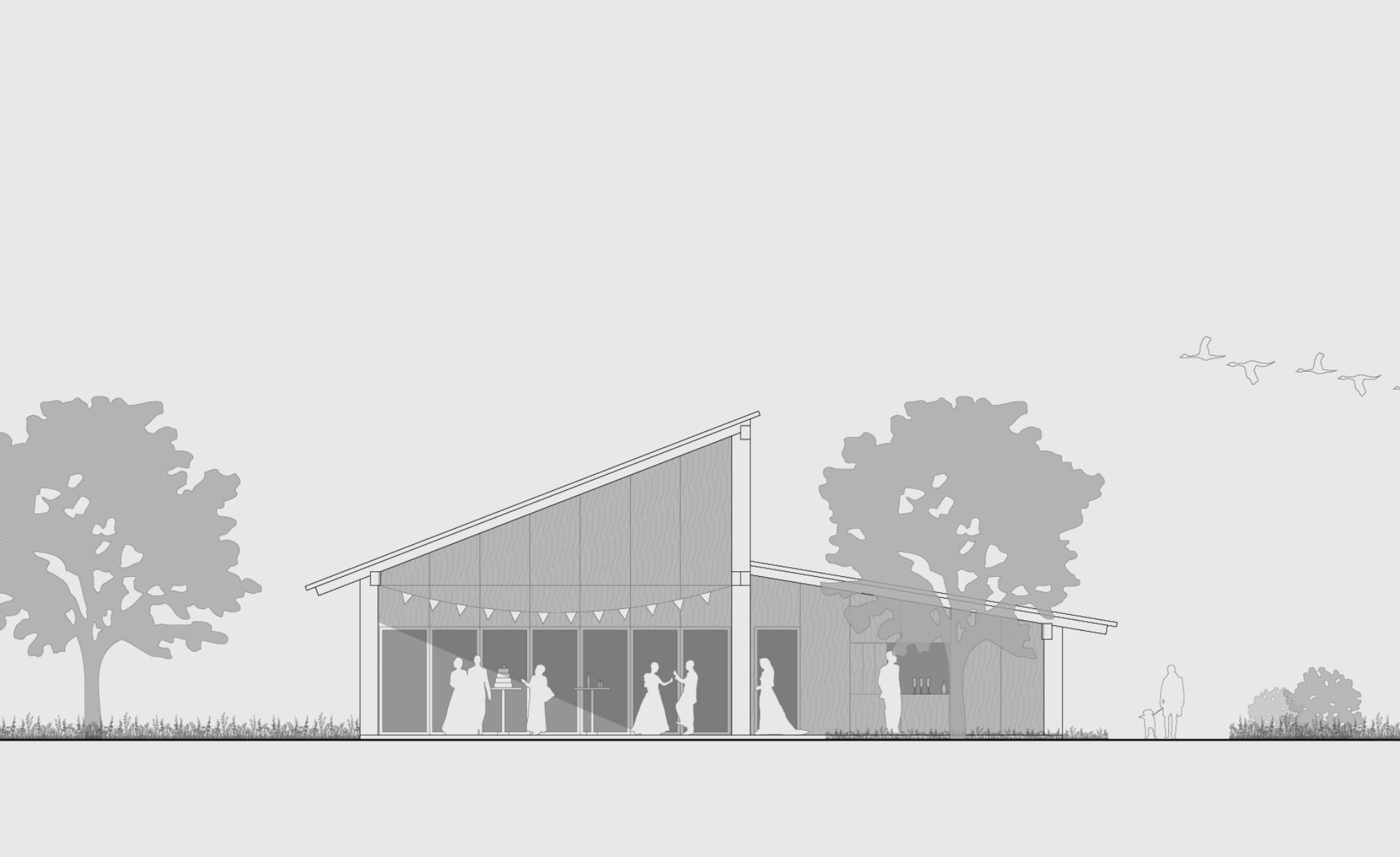Der Holzsystembau bietet grosse Flexibilität und ermöglicht eine hohe Vorfertigung in der Erstellung.Die Firstpfette des Pfarreiheims ist in der Höhe versetzt, wodurch im Innenraum interessante räumliche und visuelle Qualitäten entstehen und dem Gebäude eine prägnante Silhouette geben. Die einfache Gebäudestruktur zieht sich im Osten des Gebäudes weiter und schafft so eine gedeckte Terrasse. Diese ist sowohl direkt vom Saal, dem Herzstück des Gebäudes, als auch über den Korridor unabhängig zugänglich.