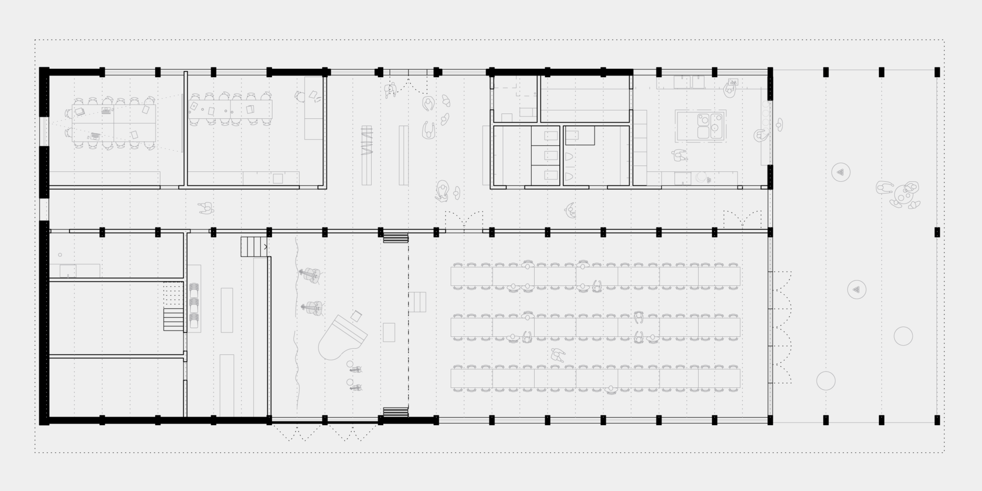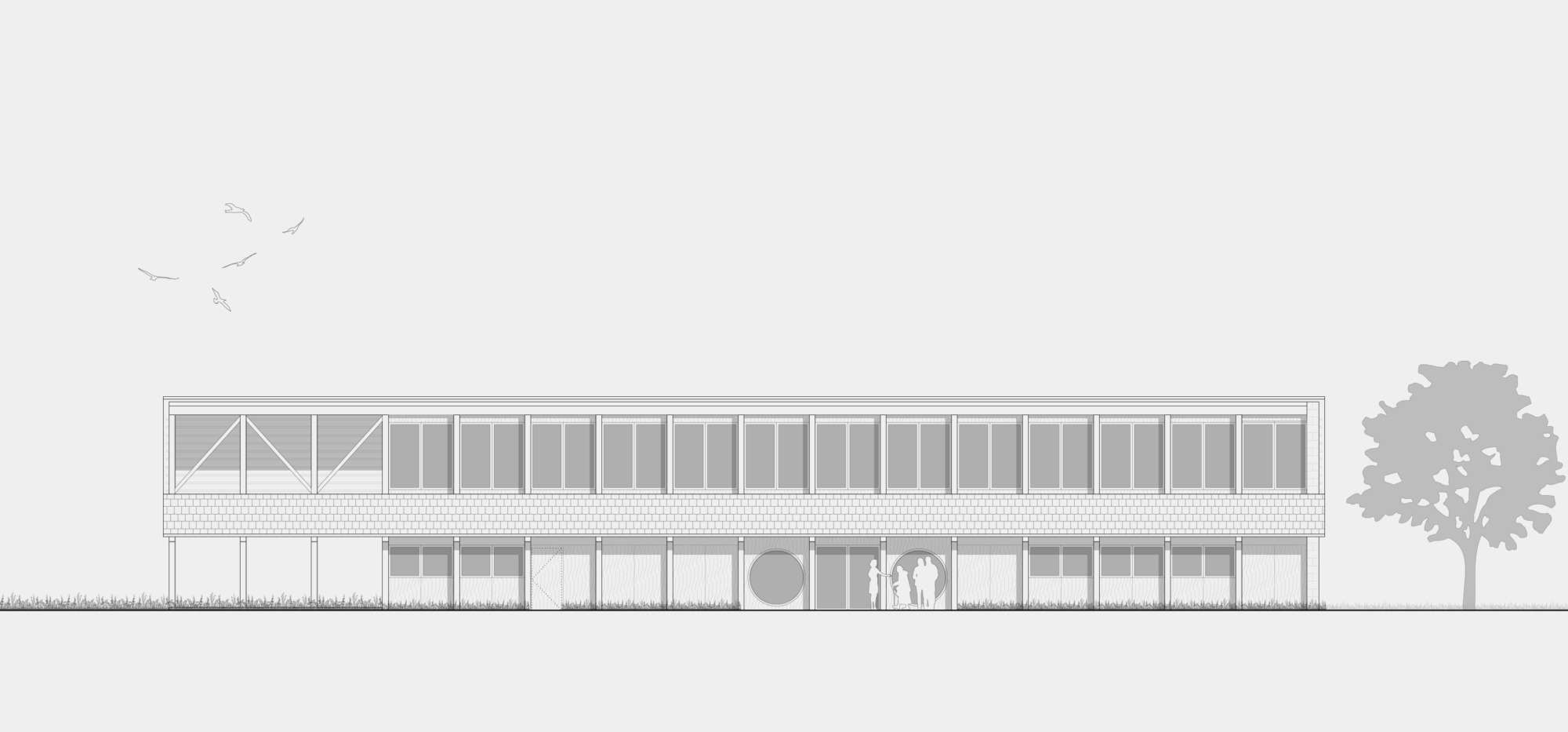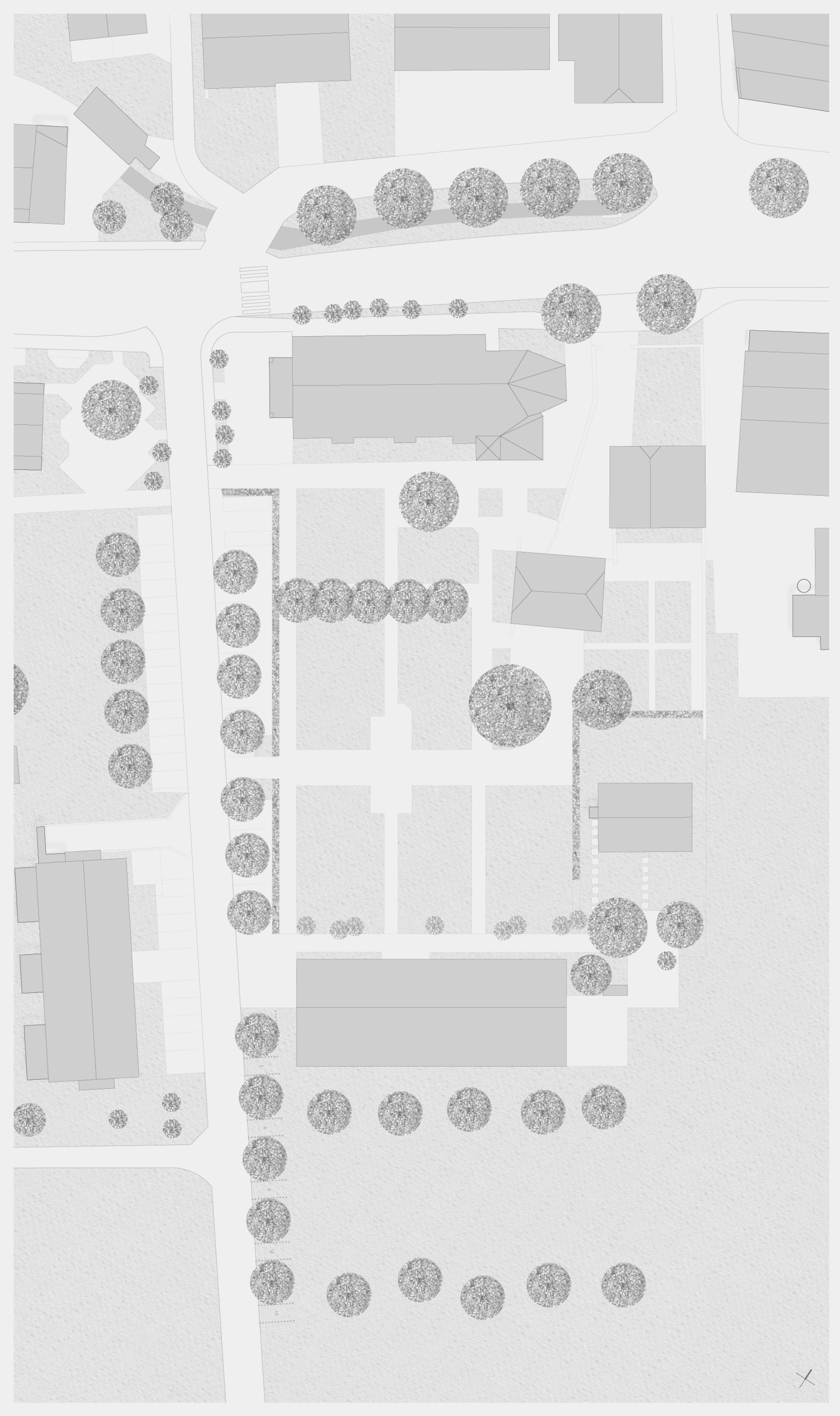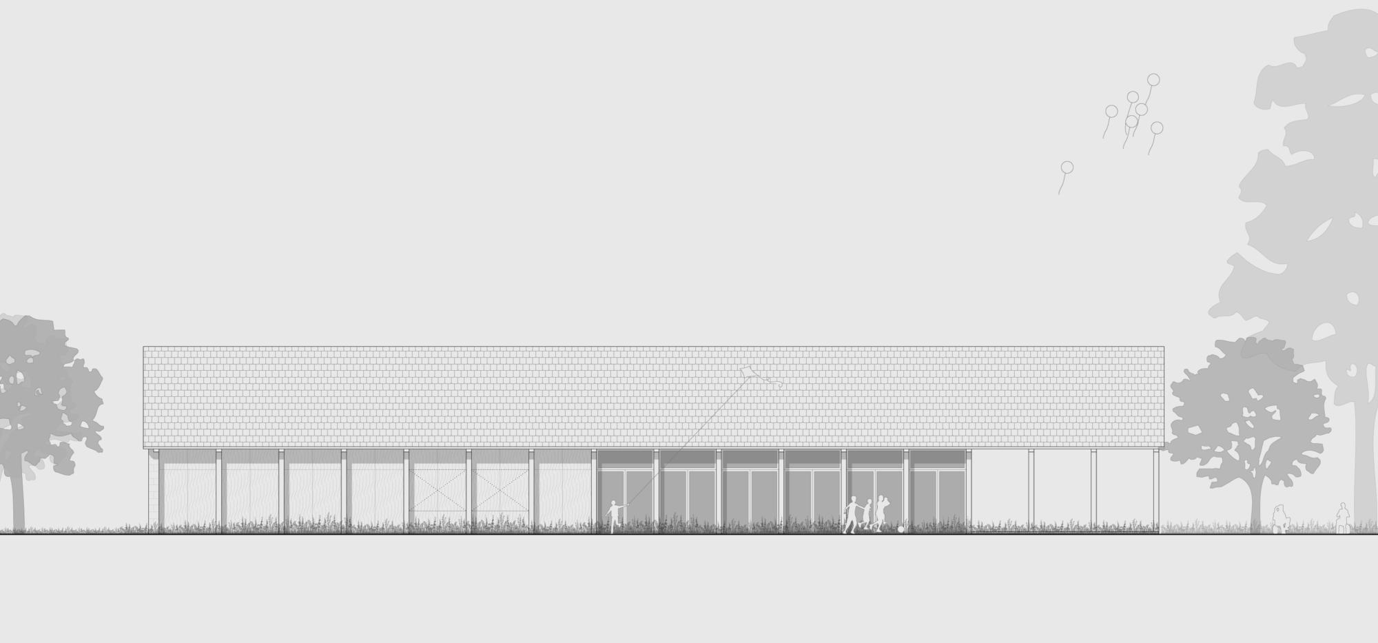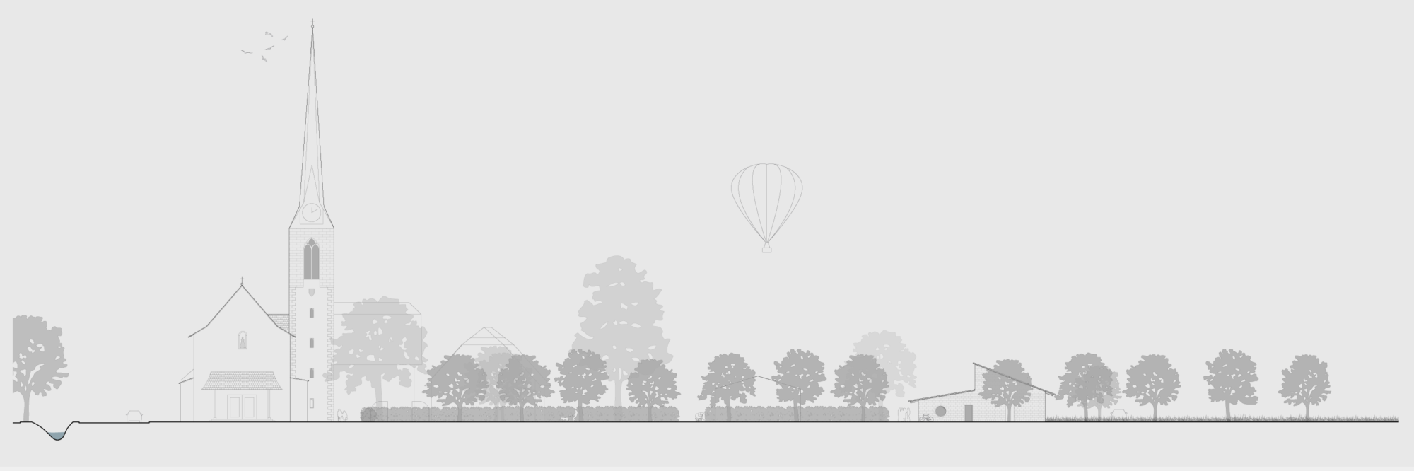 Er ist als eingeschossiger Pavillon als einfaches Gebäude geplant, welcher dank seines gleichmässigen Rasters eine grosse Nutzungsflexibilität bietet. Ein grosszügiges Foyer führt vom Eingang zum zentralen Korridor als Rückgrat des Gebäudes. Dieser verbindet die verschiedenen Nutzungen miteinander und bindet das Pfarreiheim in die anliegenden Aussenräume ein.