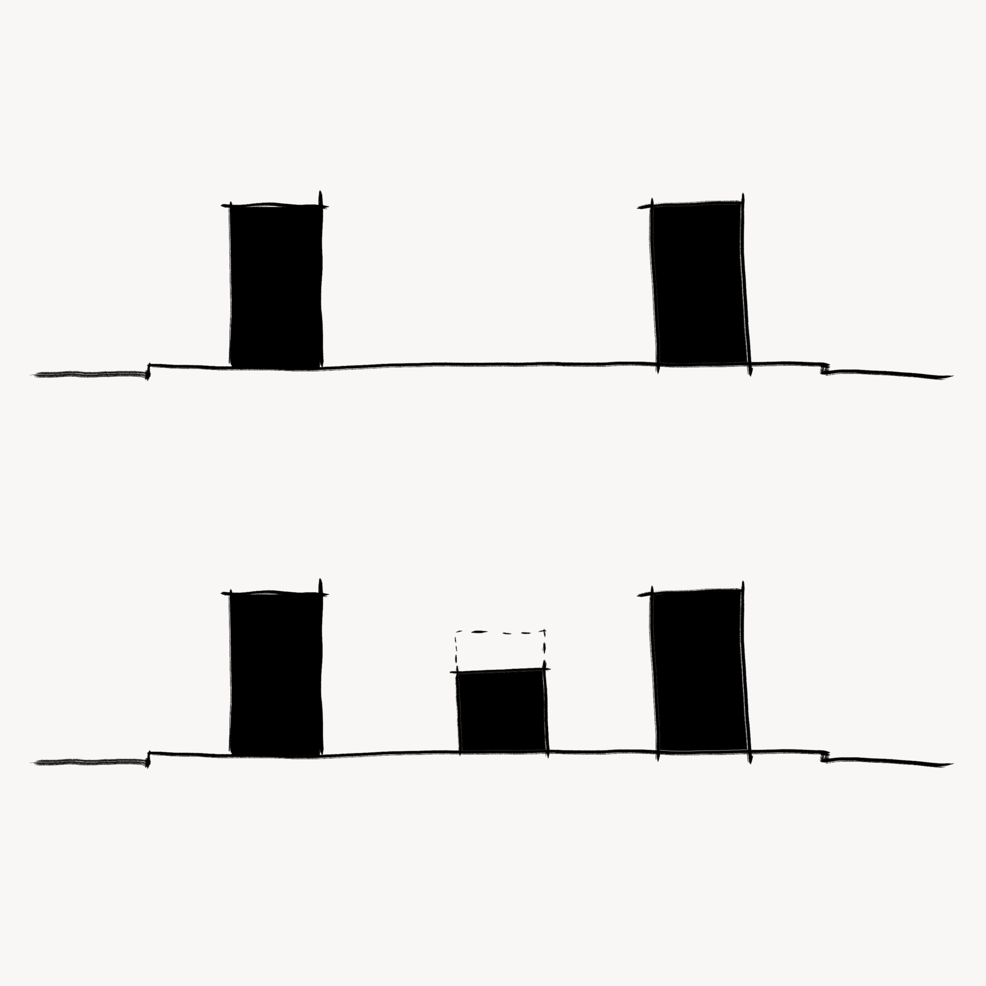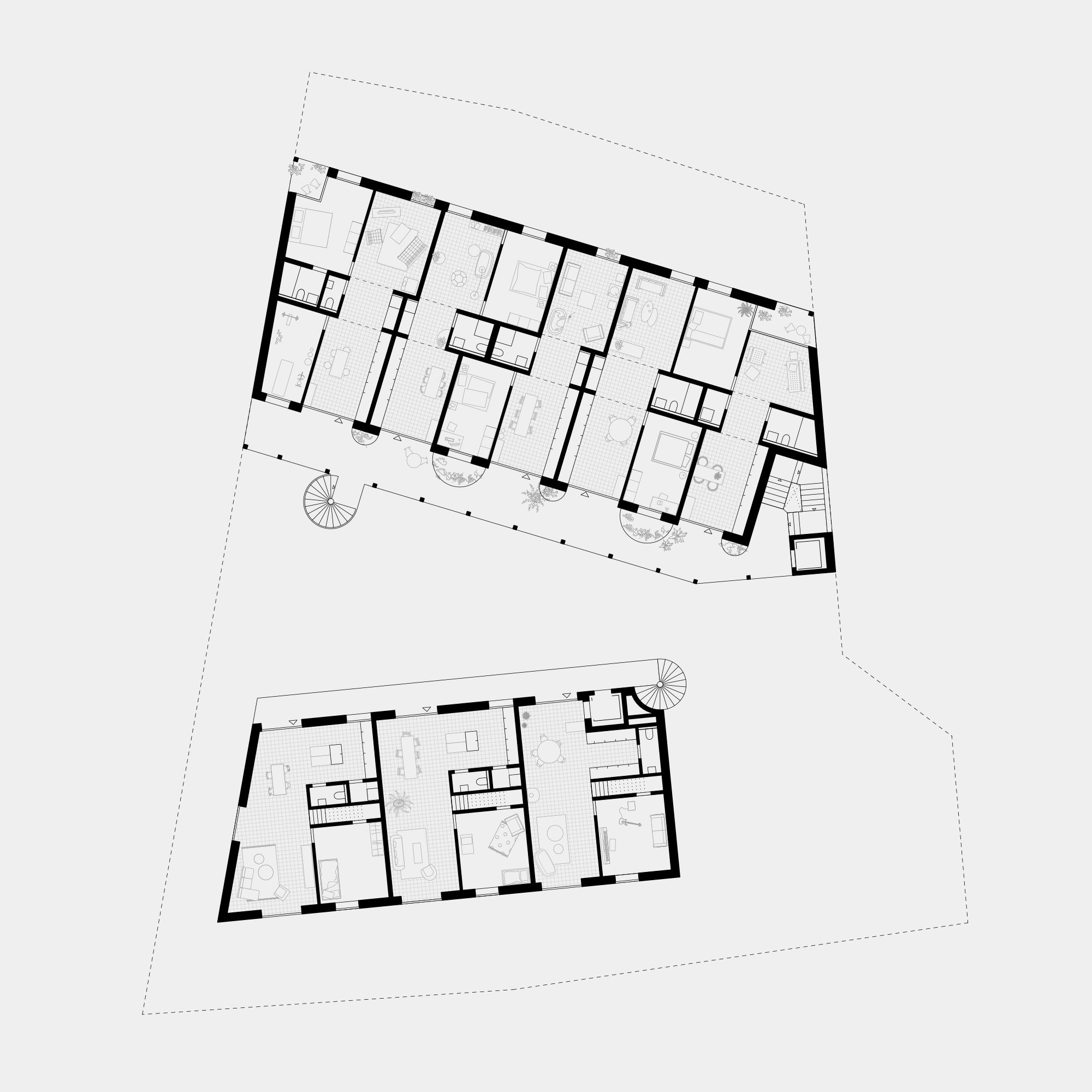 Die dadurch entstehende volumetrische Gliederung der beiden Neubauten verbindet den Masstab der städtischen Grossform mit der kleinteiligen Körnung des heterogenen Quartiers.