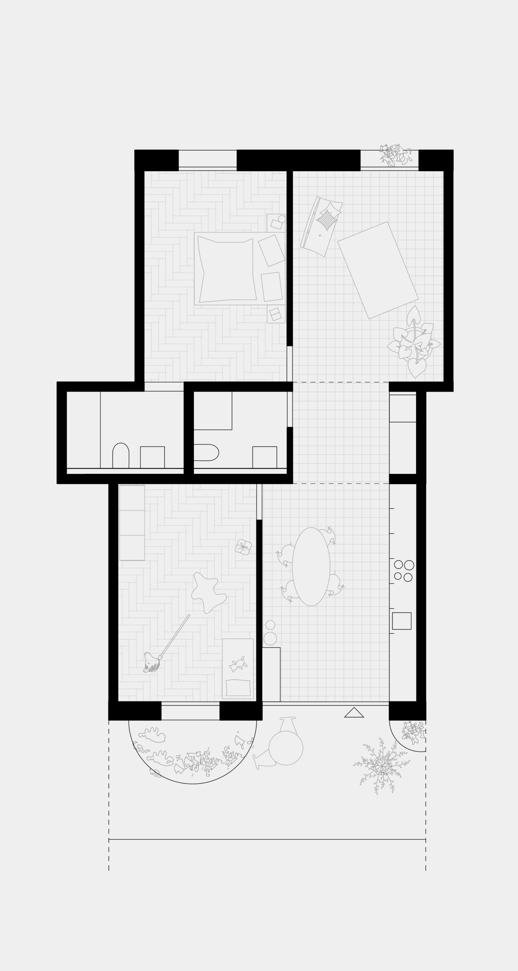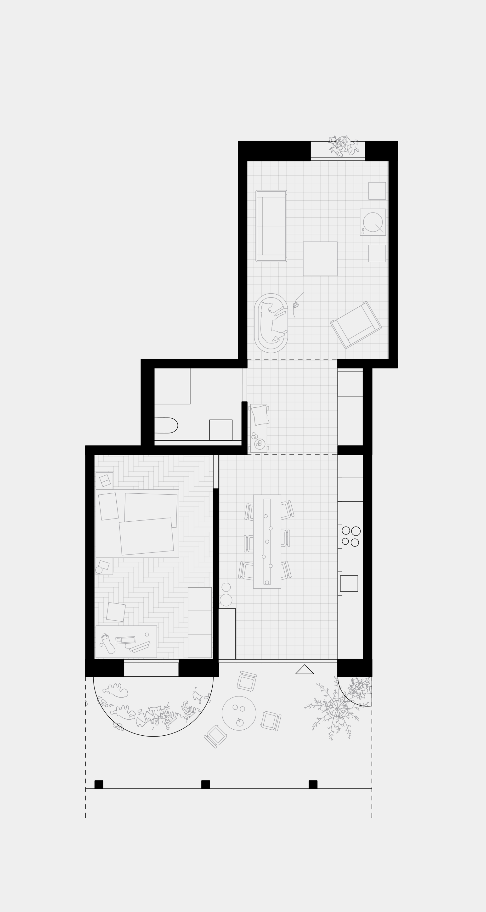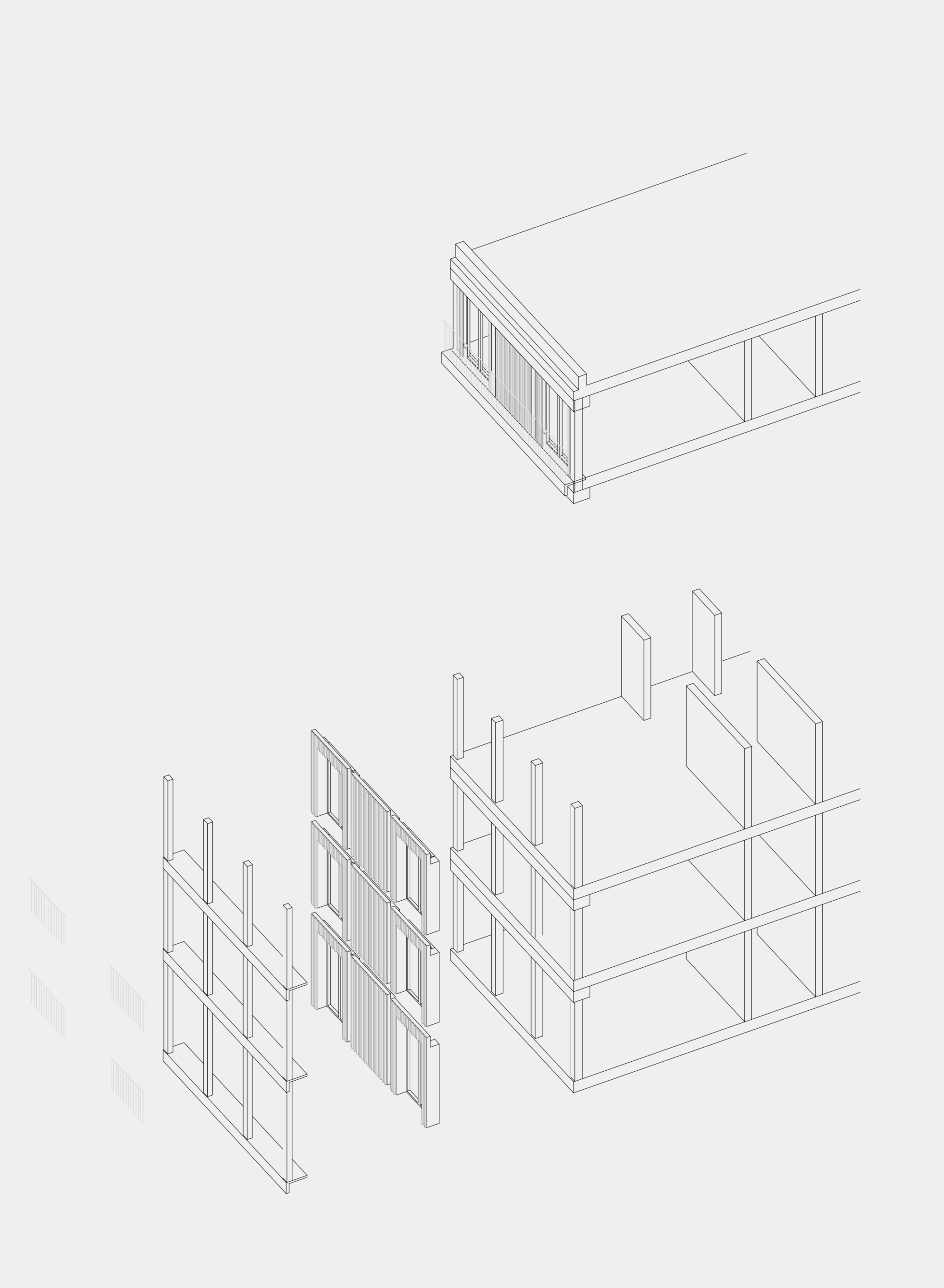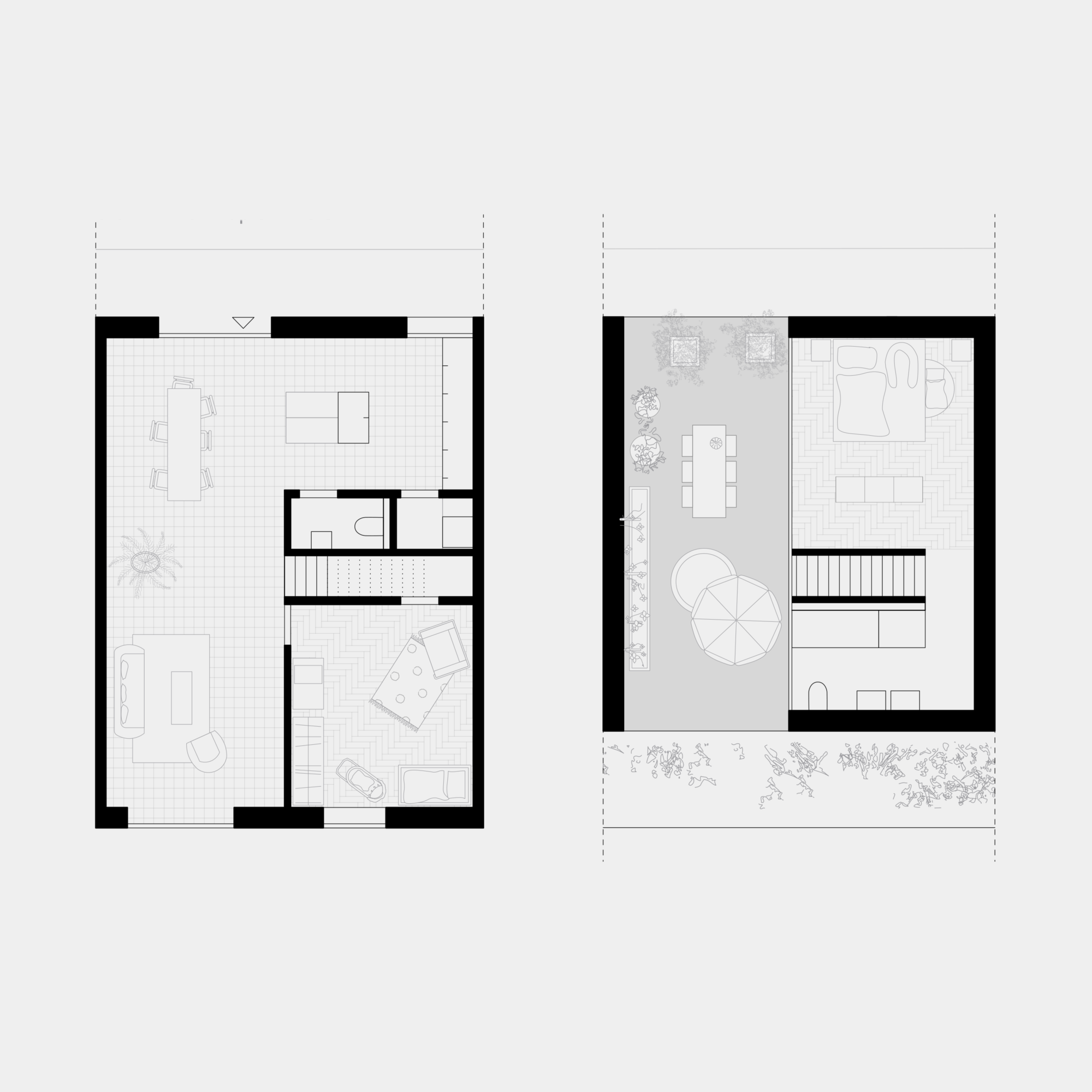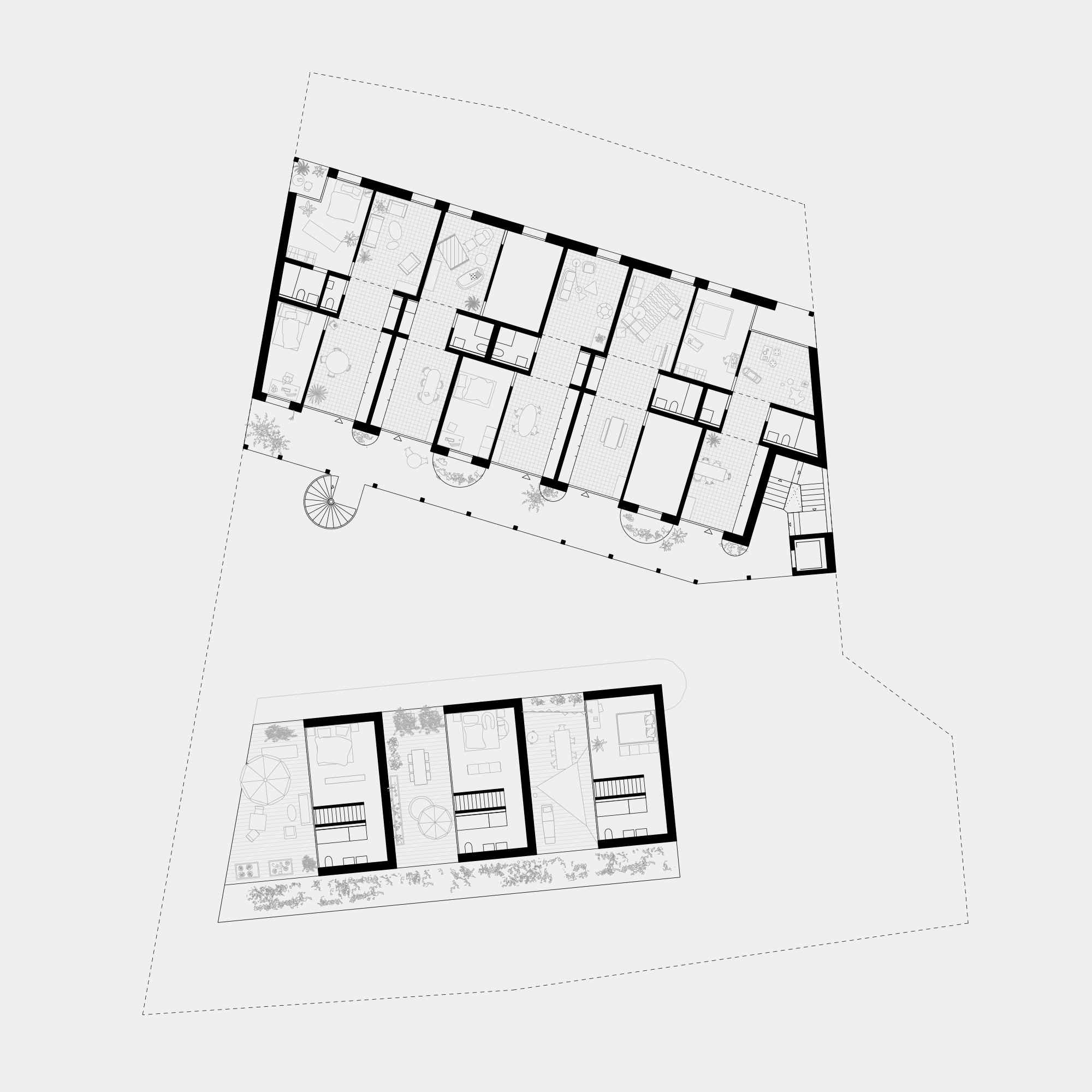 Während der Blockrand zur Strasse dicht und geschlossen gebaut ist, weist das Hofhaus eine offene, kleinteilige Struktur auf. Diese heterogene Bauweise kann auf verschiedene Voraussetzungen wie die limitierte Parzellengrösse und die Verschattung der Nachbarsgebäude- und Gärten reagieren.